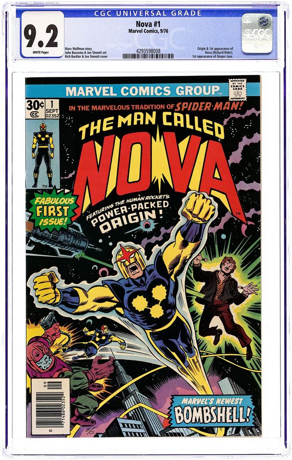 Starts Apr 4 Written by Marv Wolfman. Pencils by John Buscema. Inks Joe Sinnott. When a dying alien passes on his super-powers to Earth teenager Richard Rider, Rider becomes the man called Nova, the human rocket! In the marvelous tradition of Spider-man, Nova must now stop the murderous alien known as Zorr, or Earth is doomed! Note: First appearance of Nova. 36 pages, full color. Cover price $0.30.