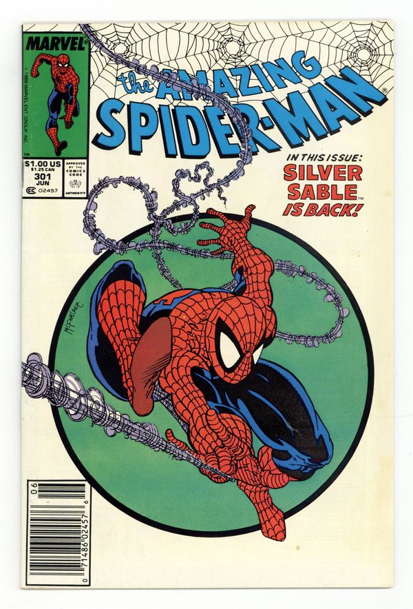 Ends Apr 16 7:26 PM CST Bid History 7 bids Current Bid $106 Your Secret Max Bid If you'd like to bid, please log in or register. Direct Edition. "The Sable Gauntlet!" Guest-starring Silver Sable. Script by David Michelinie. Art by Todd McFarlane. Cover by Todd McFarlane. The first 300 issues of the Amazing Spider-Man are in the books after the web-slinger's epic battle vs. Venom last issue! And now the next chapter in the wall-crawler's anthology begins with an encounter with his favorite mercenary: Silver Sable! The enchanting sable agrees to make a test run through the security systems of a new high-rise office building, but deadly danger awaits on the top floor! Will Spidey catch the elevator in time? Cameo appearances by Mary Jane Watson and Dr. Morris Sloan. First $1.00 issue. (Notes: The cover is the same artwork (with different colors) as the cover to issue 300. This issue includes a full-page ad for the first appearance of Typhoid Mary in the Daredevil (1st) series -- art by John Romita Jr. and Al Williamson. The letters page contains a statement of ownership: average print run 469,913; average paid circulation 284,692. 36 pgs. Cover price $1.00.