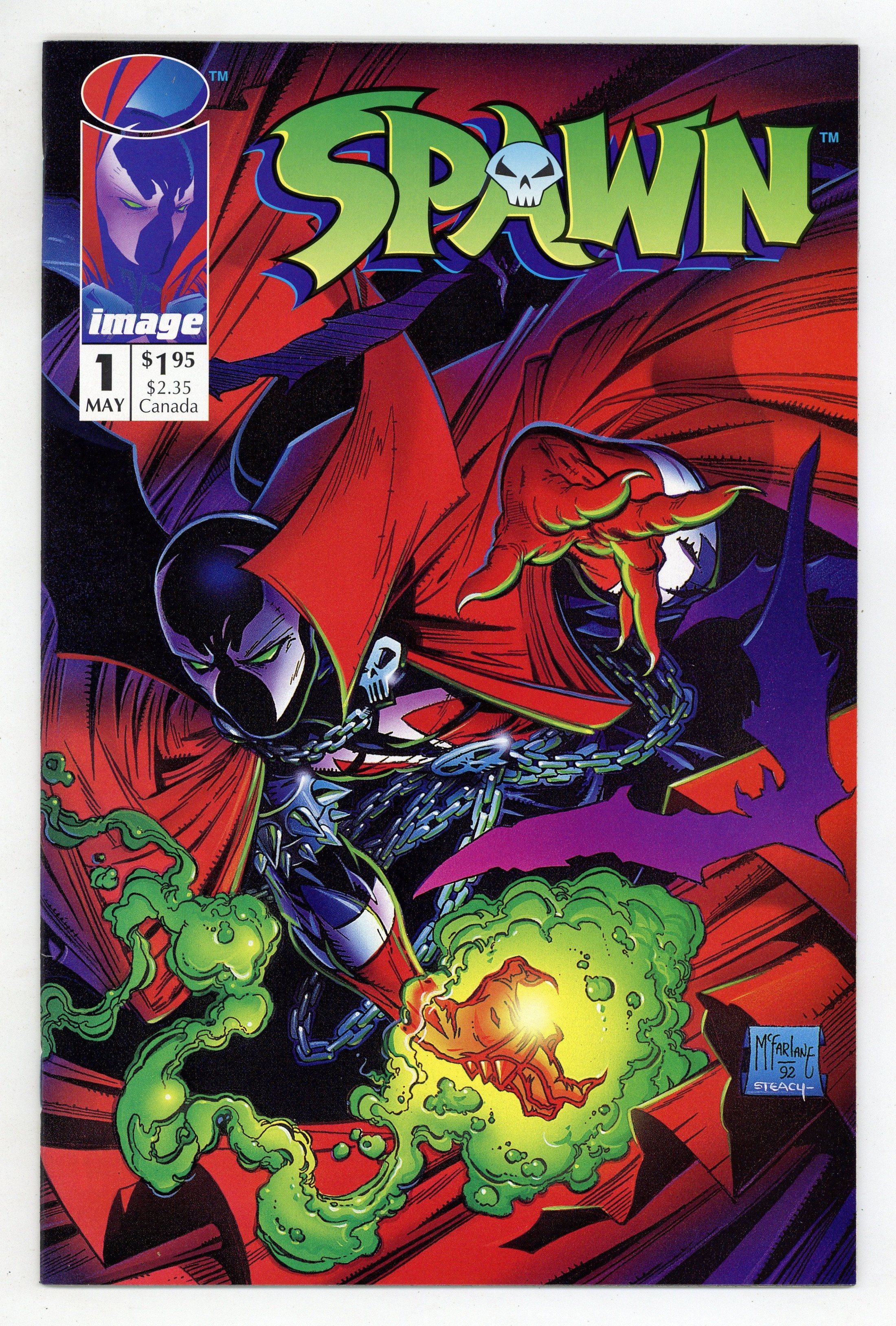 Starts Jan 3 Direct edition. "Questions!" Part 1 of 4. Created, story, and art by Todd McFarlane. When government assassin Al Simmons is murdered, a deal with the devil brings him back to the realm of the living. But now he walks the shadows as the disfigured soldier of hell known as Spawn. Armed with unimaginable, but finite, magical abilities, Spawn is destined to play an important role in the upcoming Armageddon. But, what happens when this rebellious anti-hero decides he won't fight for either side? Superstar artist and Image co-founder, Todd McFarlane, creates a character who has gone on to inspire a major motion picture, an HBO animated series, numerous spin-off comic series, and one of the most successful toylines of all time. Spawn centerfold by Todd McFarlane & Ken Steacy. Pin-up of Spawn by George Perez. Pin-up of PITT by Dale Keown. Cover by McFarlane & Steacy. 1st app of Sam and Twitch Cover price $1.95.