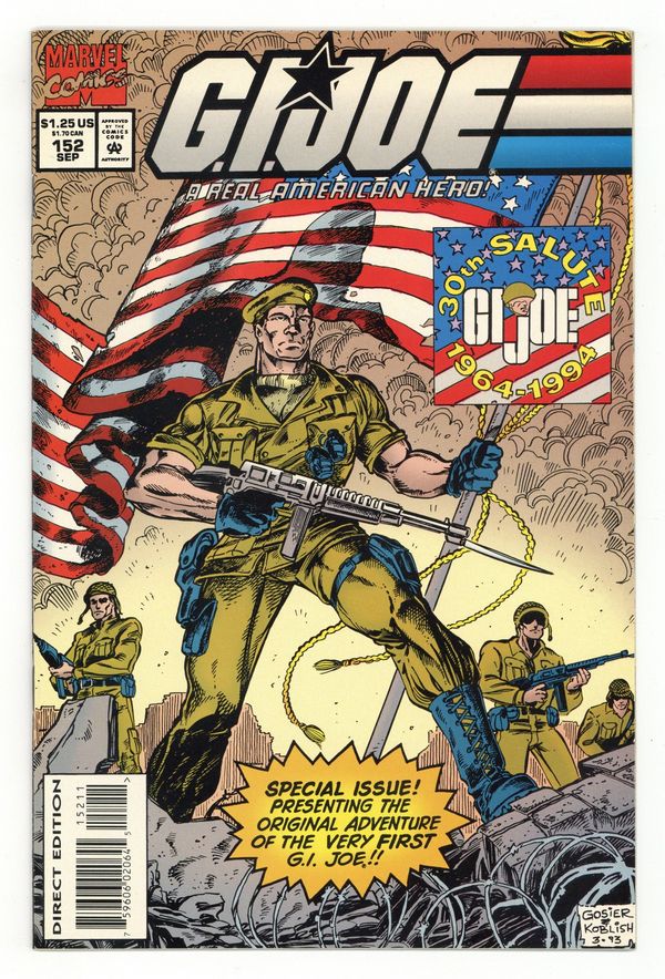 Starts Feb 23 Direct Edition. 30th Anniversary Salute. Special issue! Presenting the original adventure of the very first G.I. Joe! Characters: Ace; G.I. Joe [Joseph P. Colton] (Origin); 1st Sgt. 'Top' Wenzel; Sp4 Angel Vazquez; several unnamed Viet Cong troops; President John F. Kennedy (JFK). "...Just Fade Away" is written by Larry Hama, with art and cover by Phil Gosier and Scott Koblish. Cover price $1.25.