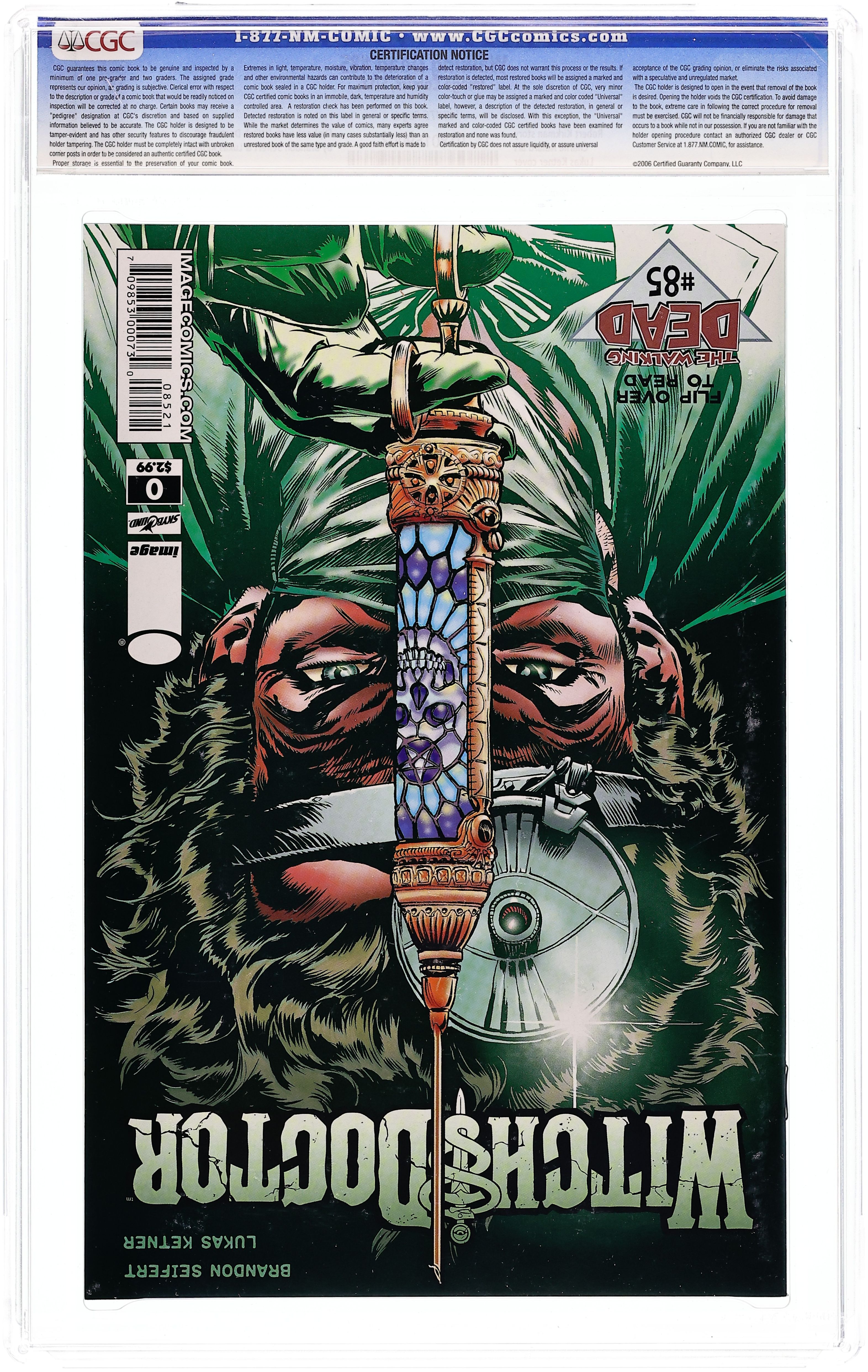 Starts Mar 16 The Walking Dead #85/Witch Doctor #0 Flip Book. Flip Covers by Lukas Ketner and Ketner & Jamie Grant. Stories by Robert Kirkman and Brandon Seifert. Art by Charlie Adlard & Cliff Rathburn and Lukas Ketner & Sunny Gho. In the Walking Dead story by Robert Kirkman, Charlie Adlard and Cliff Rathburn: Where do we go from here? Plus: Witch Doctor tale "Interview with the Tapeworm" by Brandon Seifert, Lukas Ketner and Sunny Gho. Also: 3-page article "Do...Do You Want to Do a Comic Together?" by Brandon Seifert. 44 pages, PC/PB&W (gray tones). RETAILER WARNING: MAY NOT BE SUITABLE FOR ALL AGES Cover price $2.99.