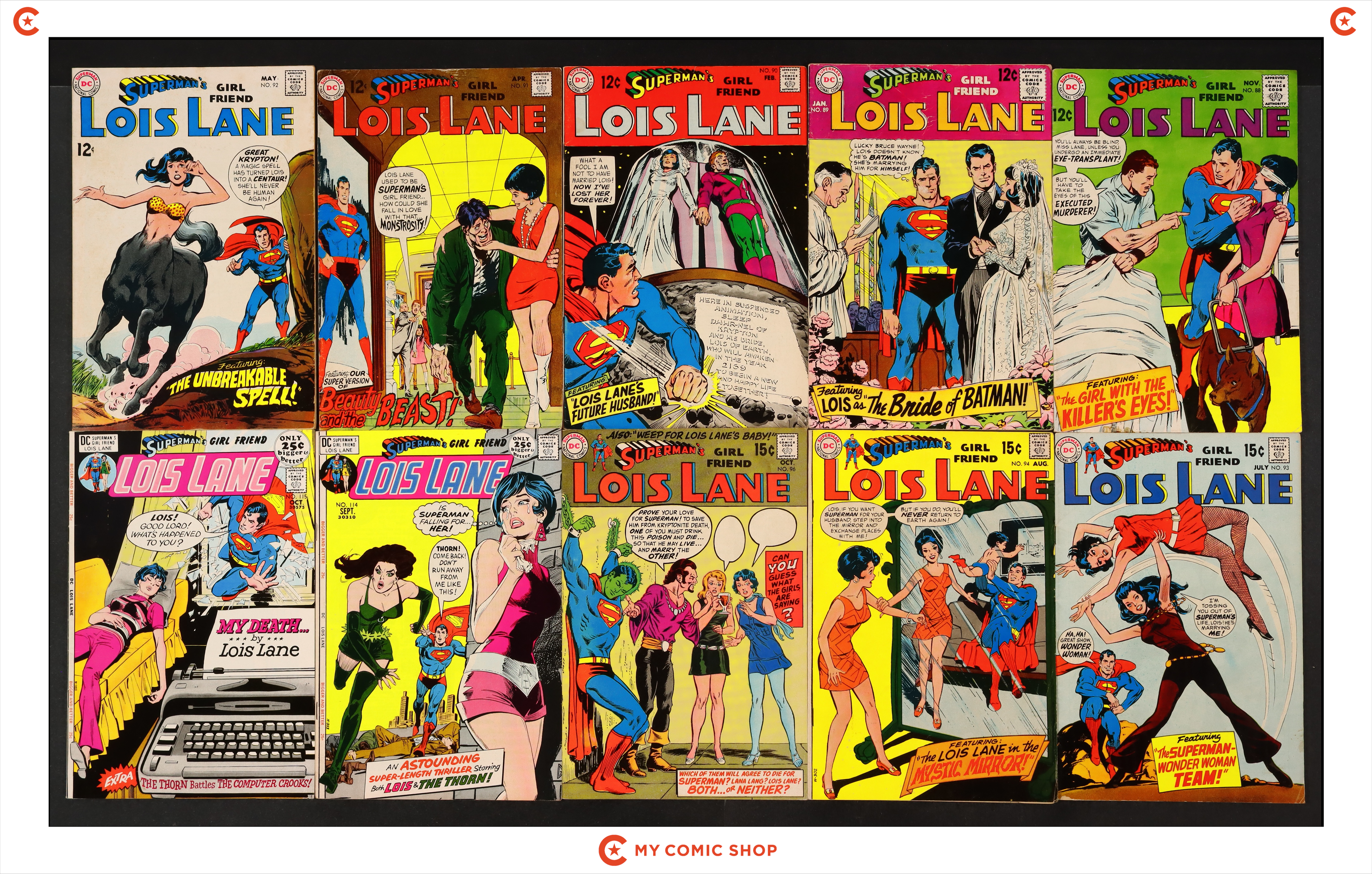 Issues 88-94, 96, 114, and 115 of Superman's Girlfriend Lois Lane (1958). Most will grade in the VG range with a couple grading FN and 89 grading GD.