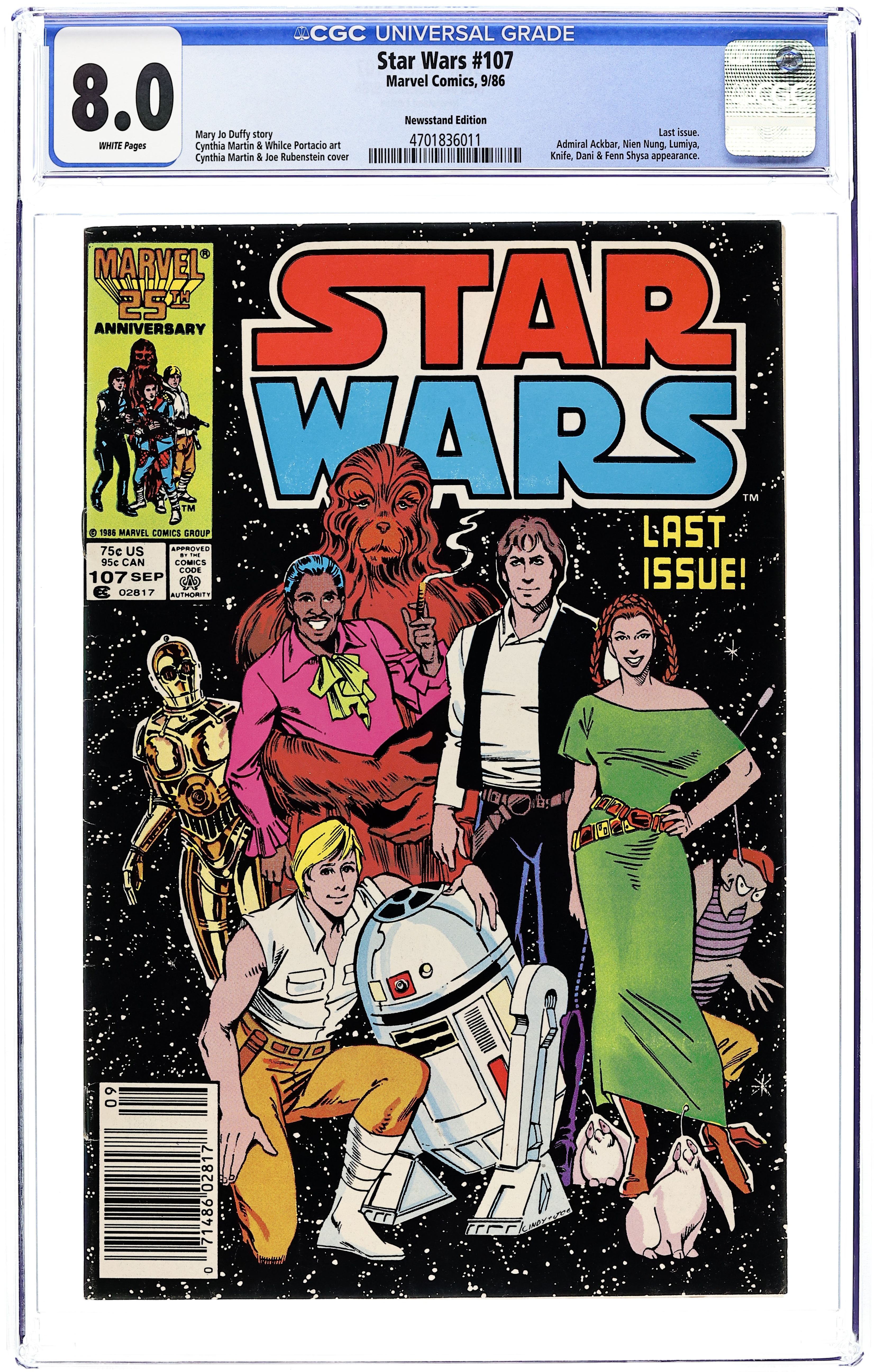 Starts Apr 20 Newsstand Edition. Final issue. A not-so-merry band of former imperials, former rebels, Mandalorians, Zeltrons, droids and Nagai are on Saijo on a mission to capture the Tof prince in "All Together Now". Script by Jo Duffy, pencils by Cynthia Martin, inks by Whilce Portacio.(scarce) Cover price $0.75.