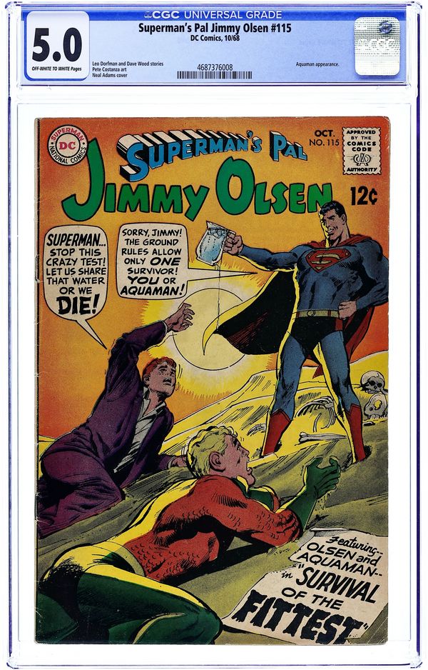 Starts May 4 Cover art by Neal Adams. Survival of the Fittest!, script by Leo Dorfman, art by Pete Costanza; Jimmy gets Aquaman's powers in a contest arranged by Proteus and becomes the King of the Sea. Super-Turtle humor page by Henry Boltinoff. The Kid Who Unmasked Superman!, script by Dave Wood, art by Pete Costanza; Duncan Brite has a plan to discover Superman's real identity. 36 Pages, Full Color. Cover price $0.12.