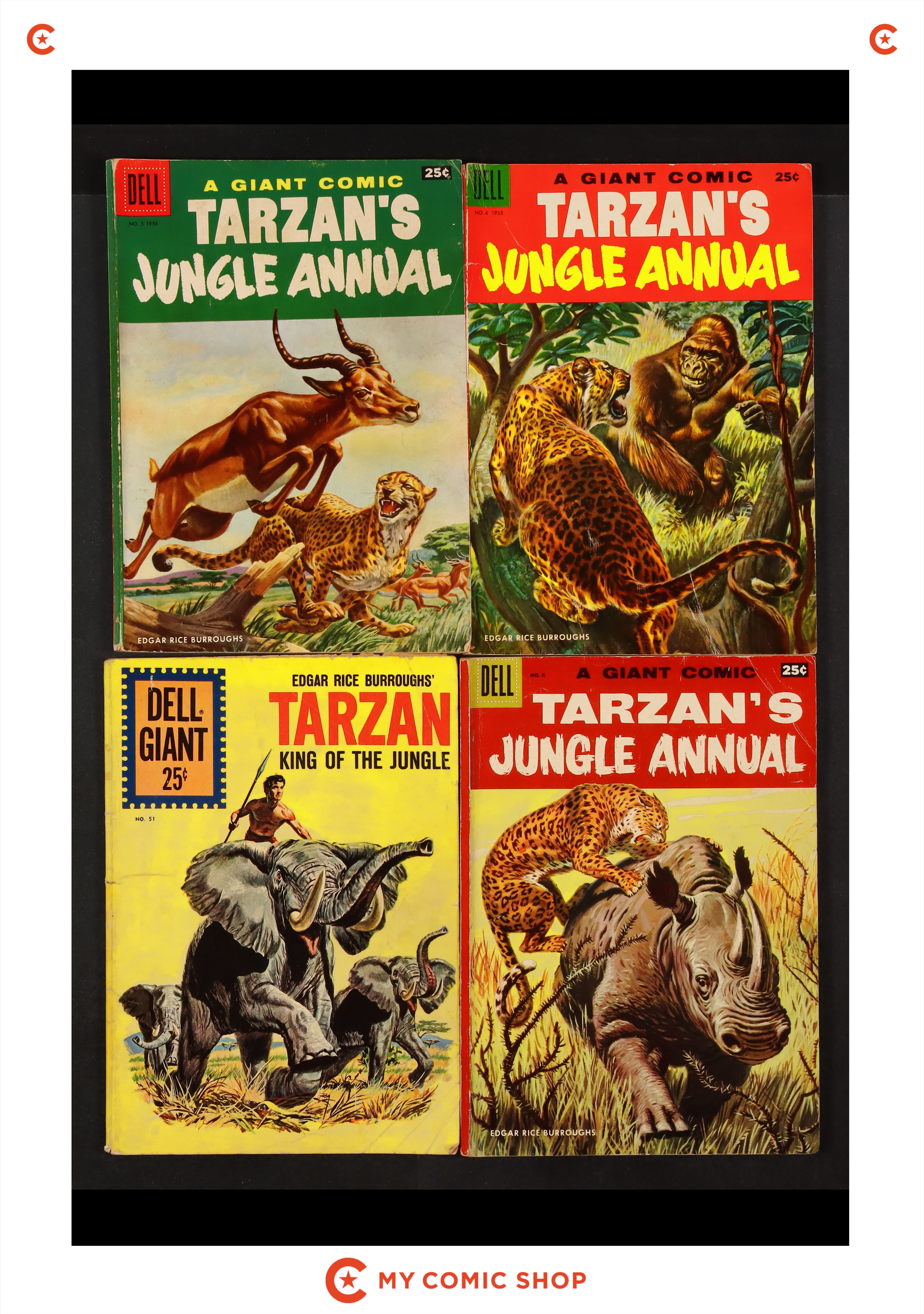 Issues 4, 5A, 6A of Dell Giant Tarzan's Jungle Annual (1952-1958 Dell); and Dell Giant (1959-1961 Dell) 51. Most will grade in the GD- to GD+ range.