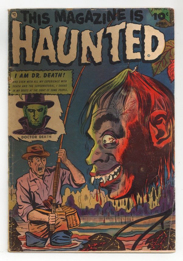 Ends Apr 13 9:42 PM CST Bid History no bids Minimum Bid $1 Your Secret Max Bid If you'd like to bid, please log in or register. Edited by Al Fago. Cover by Steve Ditko. Stories by unknown. Art by Chic Stone, Sy Moskowitz, Steve Kirkel and George Evans. Horror tales that are so scary they could only lead you to believe that This Magazine is Haunted! In this issue: A hitchhiker-hating man feels suddenly compelled to give a stranger a ride. Sitting in the seat next to him is Death in person in "The Hitchhiker" with art by Chic Stone. Plus: People get waylaid and murdered for their money inside the carnival attraction "Tunnel of Terror" with art by Sy Moskowitz. Also: A vein of gold tells us how prospector after prospector dies when finding it. Because they all forget to look out for the rattlesnakes in "I Am the Gold!" with art by Steve Kirkel. And: After two hundred years the Duke of Allister rises newly born from his casket at Carnoc Castle. Now immortal, he seeks to lead a second life. But the forces of witchcraft which granted him his gift return to haunt the Duke in "The Curse of Carnoc Castle" with art by George Evans, reprinted from issue #1. Plus: 2-page text story "The Quiet One" written by John Martin, reprinted from Unknown World (1952) #1. 32 pages, full color. Cover price $0.10.
