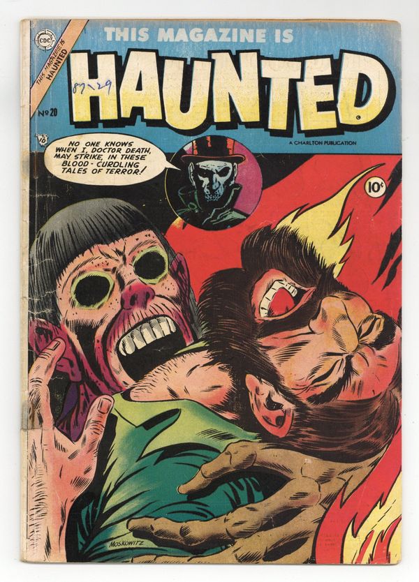 Ends Apr 13 9:42 PM CST Bid History no bids Minimum Bid $1 Your Secret Max Bid If you'd like to bid, please log in or register. Edited by Al Fago. Cover by Sy Moskowitz. Stories by unknown. Art by Dick Ayers, Ernie Bache, Steve Kirkel, Bill Molno, Ray Osrin, Bernard Baily and unknown. No one knows when Dr. Death may strike in these blood-curdling tales of terror! Horror tales that are so scary they could only lead you to believe that This Magazine is Haunted! In this issue: Medieval Italy: misshapen hunchback Fernando wants to win the people's affection by building them a magnificent monument. But the construction has its flaws in "The Monument" with art by Dick Ayers and Ernie Bache. Plus: A group of adventurers find the treasure of Ulysses. Cursed as it is, the men have to relive the perils of the Odyssey and get decimated one by one in "The Curse of the Odyssey" with art by Steve Kirkel. Also: Victor Manson can retrieve his wife from Death's realm -- and trick the devil -- in "Quest of the Beyond!!" with art by Bill Molno (as Joe Shuster) and Ray Osrin. And: Karl Danner steals the coat of a dying man and uses the ticket he finds in its pockets to escape aboard a ferry. Unfortunately he has chosen the ferry of the dead and is doomed to ride along in "Stand-in for Death" with art by Bernard Baily, reprinted from issue #1. Plus: 2-page text story "The Simbis of Zimbabwe," and 1-page story "Facts About Witches and Witchcraft"! 32 pages, full color. Cover price $0.10.