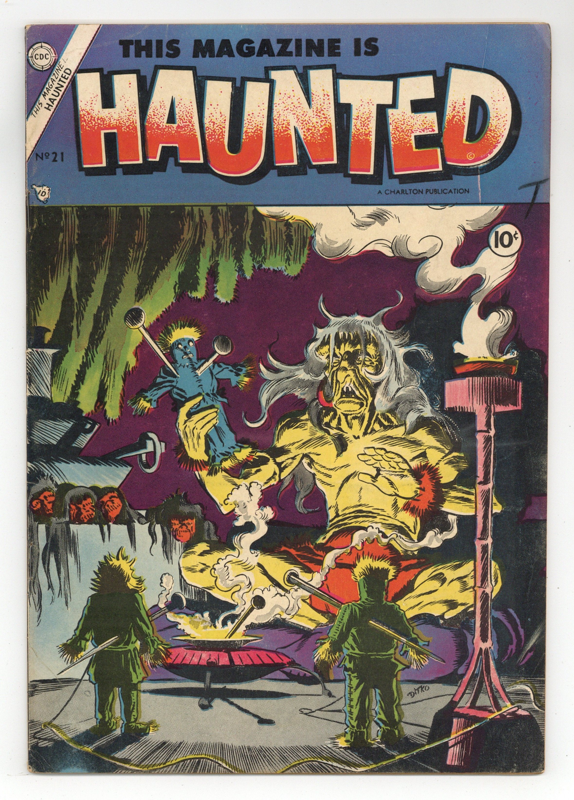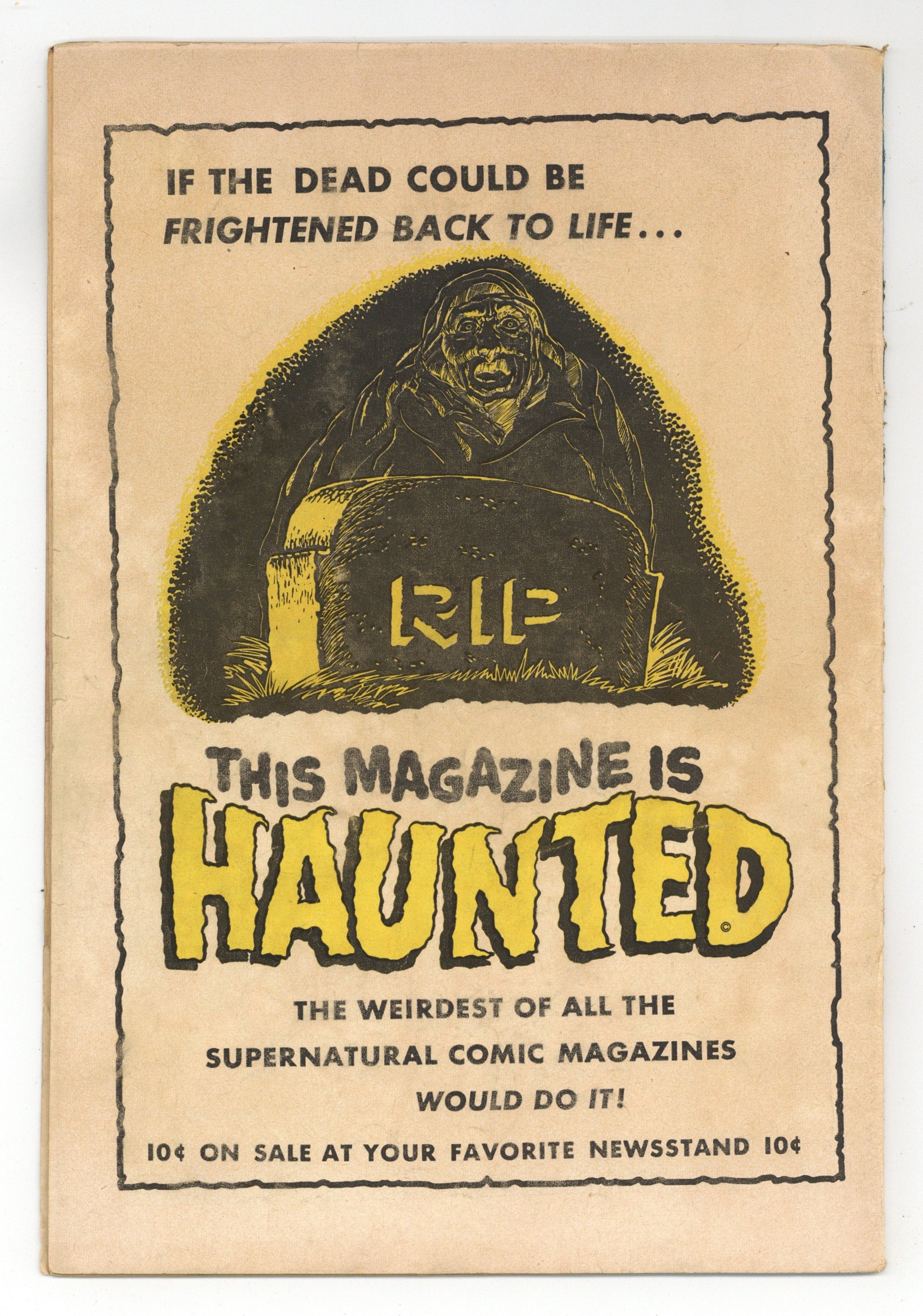 Ends Apr 13 9:41 PM CST Bid History no bids Minimum Bid $1 Your Secret Max Bid If you'd like to bid, please log in or register. Edited by Al Fago. Cover by Steve Ditko. Stories by unknown. Art by Bill Molno, John Belfi, Steve Ditko, Shelly Moldoff and Sy Moskowitz. Horror tales that are so scary they could only lead you to believe that This Magazine is Haunted! Includes EC swipe of Haunt of Fear #5, injury to eye panel. In this issue: Xanadu, the misshapen youngest brother of four, plots and schemes his way to the throne. Having disposed of his brothers, Xanadu is faced with their ghostly revenge in "The Last Earl!" with art by Bill Molno (as Joe Shuster) and John Belfi. Plus: An evil man is marrying women for money and killing them afterwards. One of them, though, returns from the grave and surprises her former husband in "Bridegroom, Come Back!" with art by Steve Ditko. Also: Graverobber Charley Deffer takes over the job of the cemetery caretaker, because the dead themselves have chosen him in "Caretaker of the Dead" with art by Shelly Moldoff, reprinted from Beware Terror Tales (1952) #1. And: A jeep crashes in the jungle and a party of four is led before the Grand Kabah, the master of death. All fail their test in this realm between life and afterlife in "Valley of Shadow" with art by Sy Moskowitz. Plus: 2-page text story "The Land of No Place"! 36 pages, full color. Cover price $0.10.