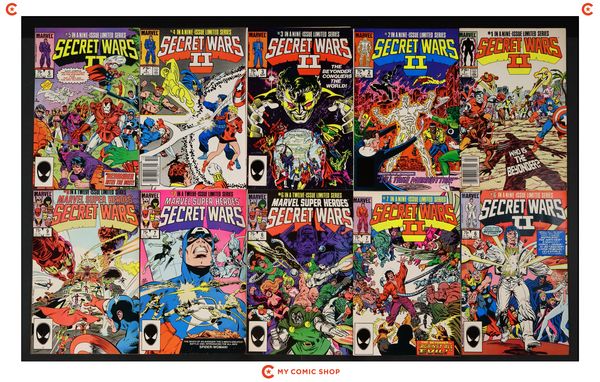 Issues 1D, 2D, 3D, 4-9 of Secret Wars II (1985 Marvel); and Marvel Super Heroes Secret Wars (1984) 9D. Most will grade in the VG to FN+ range.