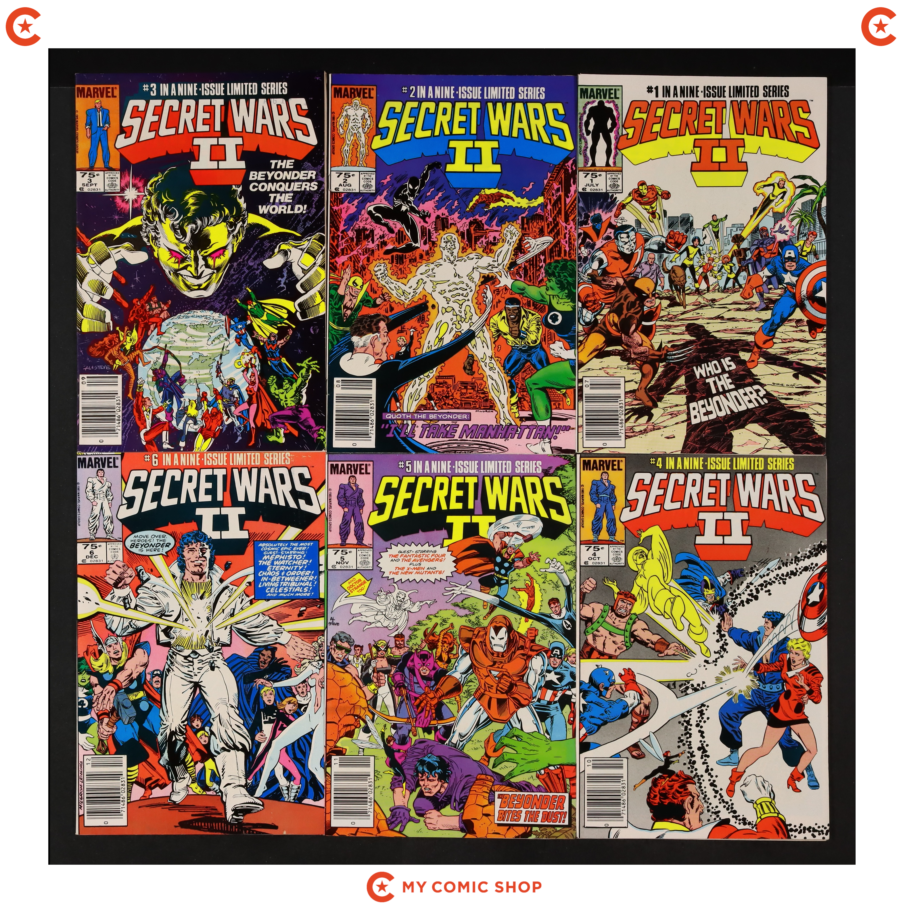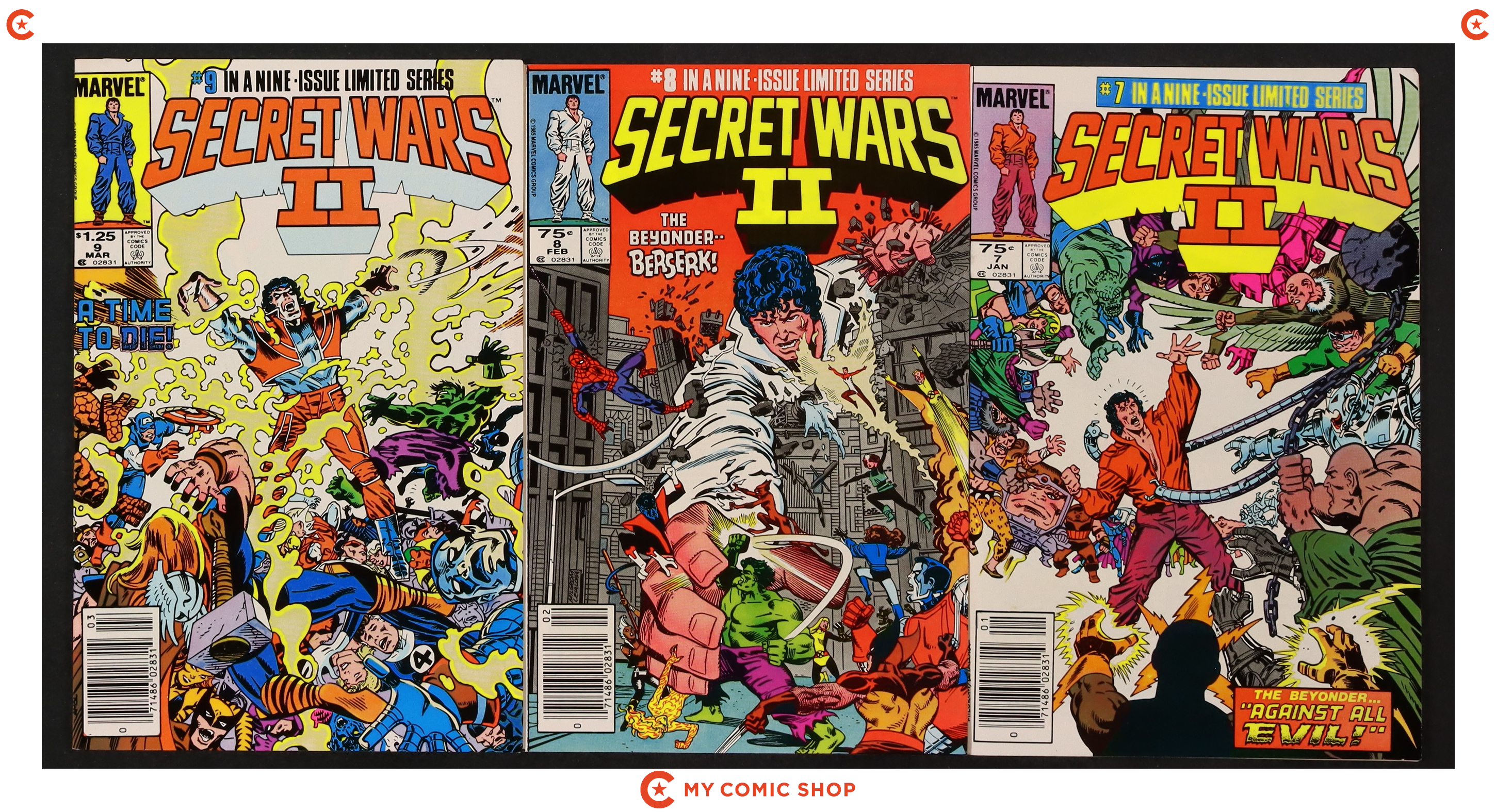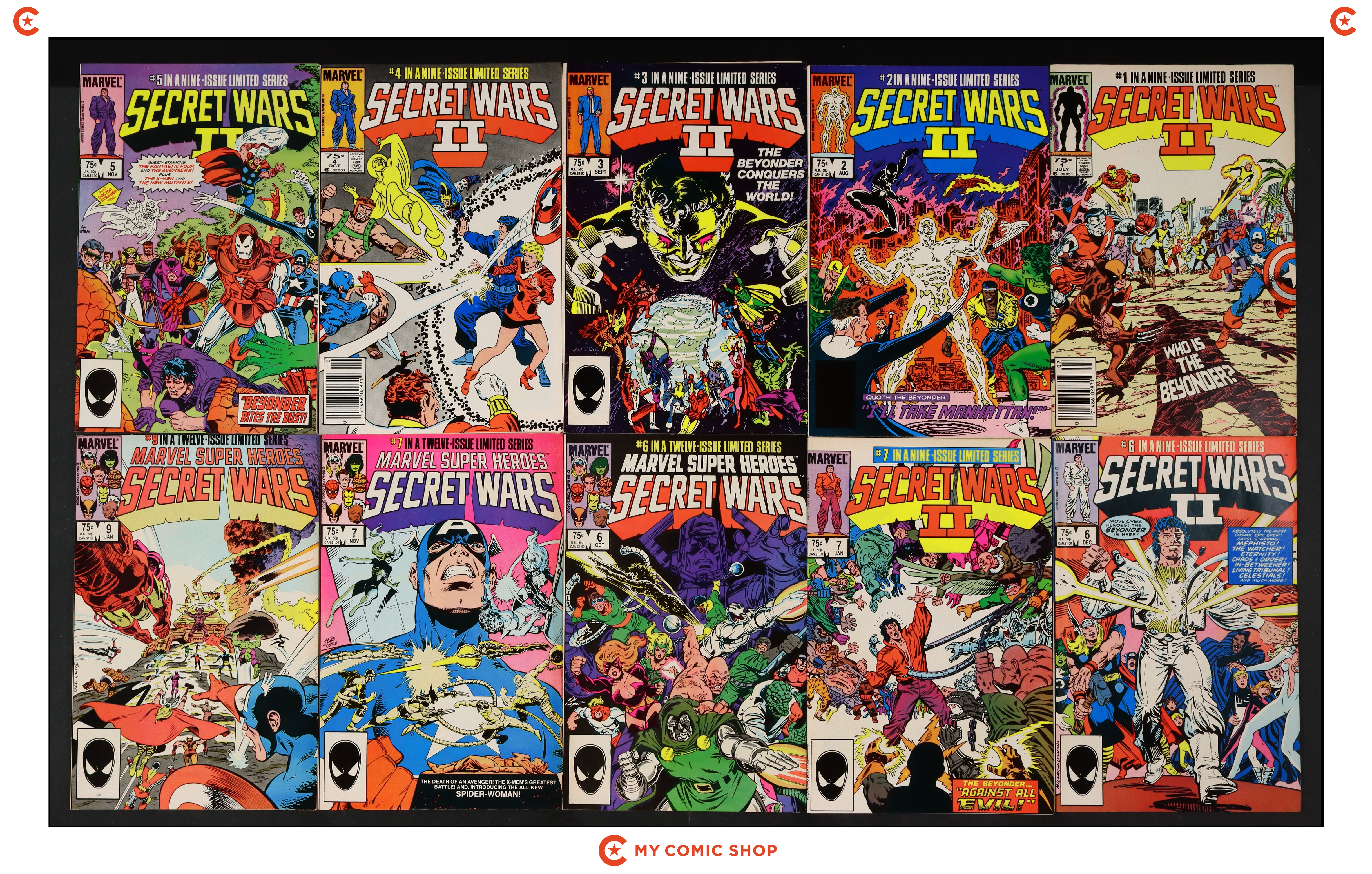 Issues 5N, 6N, 7D, 9N, 11D, 12D of Marvel Super Heroes Secret Wars (1984); and 1D, 2D, 3N, 6 of Secret Wars II (1985 Marvel). Most will grade in the VG/FN to FN/VF range, with 9 grading at GD-.