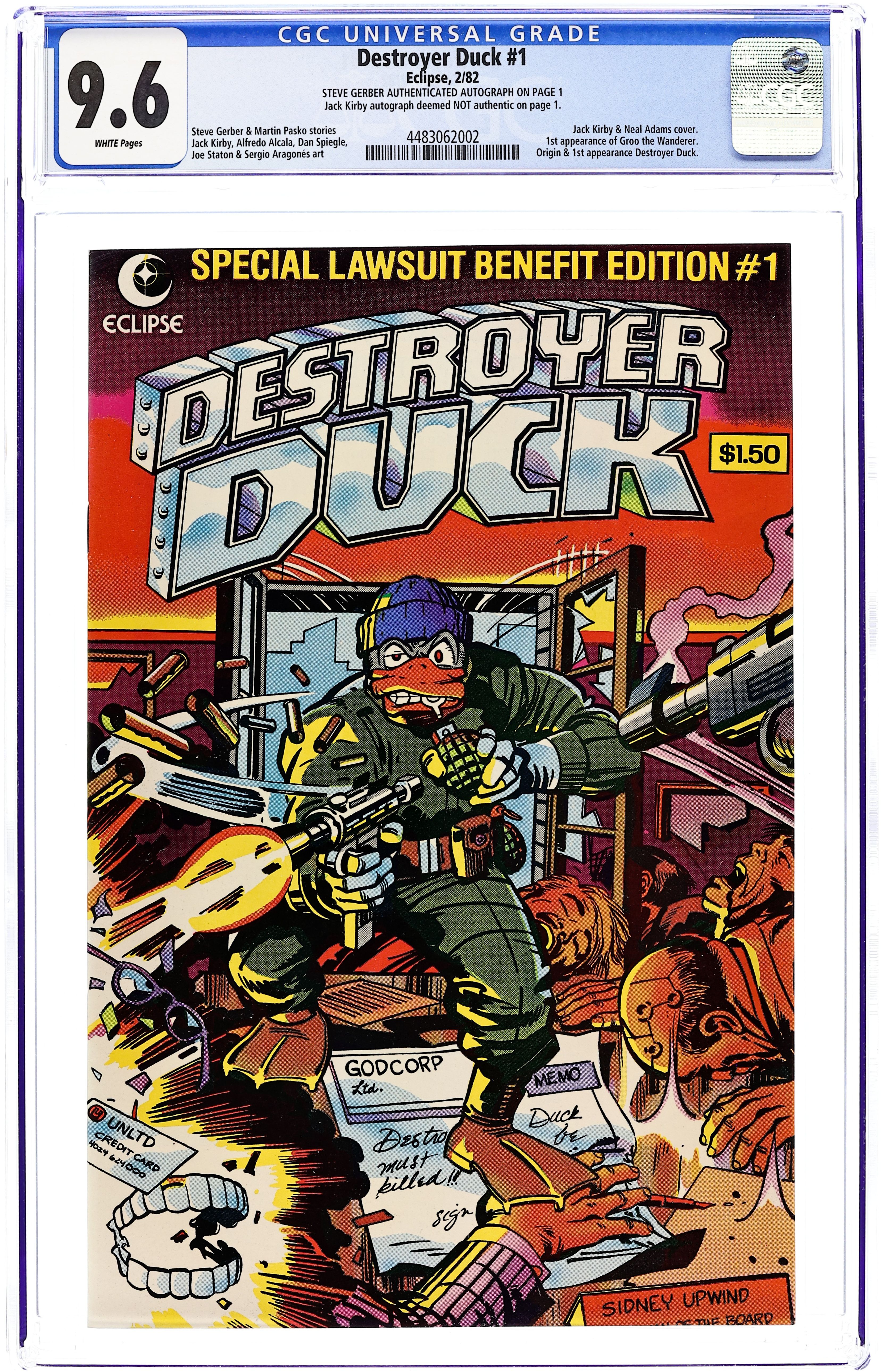 Starts Jan 3 "Special Lawsuit Benefit Edition." At the height of their legal battles with Marvel, Steve Gerber and Jack Kirby teamed up for this benefit comic, in which a gun-slinging duck seeks revenge against an evil megacorporation. Art and stories donated by Mark Evanier, Dan Spiegle, Scott Shaw!, Alfredo Alcala, Steve Leialoha, Shary Flenniken, Martin Pasko, and Joe Staton. All this plus the first-ever appearance of Sergio Aragones' Groo the Wanderer. Full color; 36 pages. Cover by Kirby and Neal Adams! Cover price $1.50.