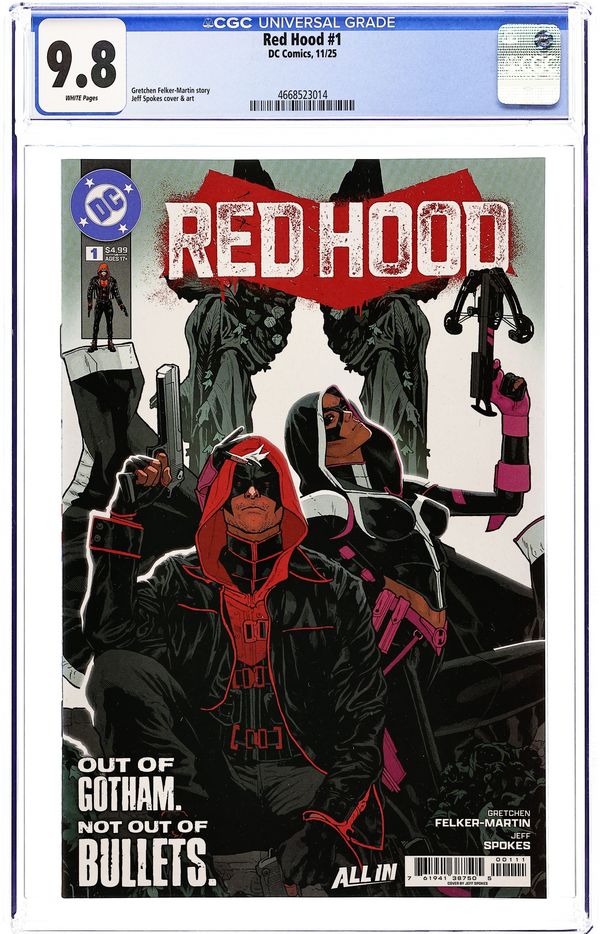 Ends Jan 16 9:02 PM CST Bid History 9 bids Current Bid $77 Your Secret Max Bid If you'd like to bid, please log in or register. Limited 1 for 50 Retailer Incentive Variant Cover. Written by Gretchen Felker-Martin. Art by Jeff Spokes. Cover by Jim Lee. ERUPTING FROM THE EVENTS OF H2SH COMES DC'S FIRST-EVER IN-CONTINUITY, MATURE READERS, ONGOING RED HOOD SERIES! Jason Todd has left Gotham and Batman behind him. All he's taking with him is his costume, his bike, and a metal briefcase containing two handguns (and lots of bullets). New Angelique seems like the perfect place for Red Hood to put down roots. There's crime, vice, and corruption everywhere. When Jason discovers a superpowered serial killer who is targeting the city's police, he finds himself sucked into a terrible and bleak conspiracy with seemingly no end in sight. But Jason isn't the only person on the scene. Following his trail is Helena Bertinelli a.k.a. Huntress. Is she here to stop him or help him? What will happen when the two black sheep of the Bat-Family start working together? Get ready for Red Hood like you've always wanted to see him. Cover price $5.99.