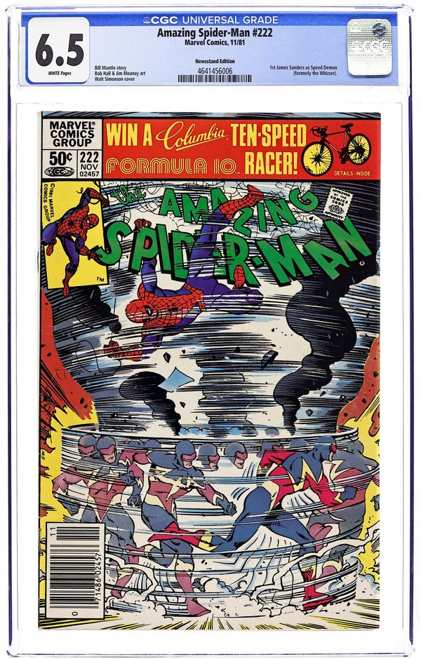 Ends Jan 15 7:27 PM CST Bid History 11 bids Current Bid $88 Your Secret Max Bid If you'd like to bid, please log in or register. Newsstand Edition. "Faster than the Eye!" Script by Bill Mantlo. Pencils by Bob Hall. Inks by Jim Mooney. Cover by Walt Simonson. The new and improved Speed Demon is on the loose! And robbing various department stores left and right! But when the lightning-fast villain brags about hitting the Bloomingdale's next, your friendly neighborhood web-slinger decides to go shopping! After the Speed Demon cruises through the display counters and merchandise racks, he encounters a wall-crawling roadblock! Will the Speed Demon run through the express checkout? Or will Spider-Man cancel his order? A fun story! Cameo appearances by J. Jonah Jameson, Joe Robertson, and Lance Bannon. Flashback cameos by the Grandmaster, Thor, Goliath, and Captain America. (Notes: The Speed Demon previously appeared in Avengers Annual 8 (as the Whizzer of the Squadron Sinister). He returns in Marvel Team-Up 121. Ed Hannigan provided the cover sketch.) 36 pages. 50 cent cover price. Cover price $0.50.