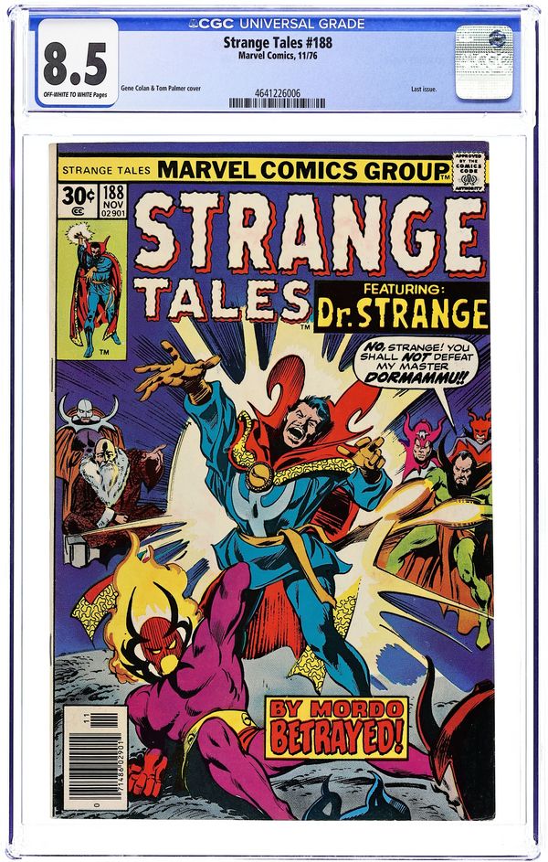 Starts Feb 2 Final issue of the series. Cover pencils by Gene Colan, inks by Tom Palmer. Doctor Strange reprints: "The Pincers of Power" (from Strange Tales 140), script by Steve Ditko (plot) and Stan Lee (dialogue), art by Steve Ditko; Dormammu sends Strange, Mordo & The Ancient One to a neutral dimension; He then uses a sleeping potion on the Mindless Ones, so his domain will be temporarily safe and summons rulers of nearby dimensions; Dormammu arrives to challenge Strange in person to battle for total mastery of Earth!; Strange accepts, then Dormammu declares they shall fight using only the "Pincers Of Power" and no other spells or incantations. "Let There Be Victory" (from ST 141), script by Steve Ditko (plot) and Stan Lee (dialogue), art by Steve Ditko; Dormammu consigns Mordo to the Dimension of Demons; Strange declares he is able to continue the fight and manages to best him in combat! Dormammu swears not to attack Earth; Back in The Ancient One's home, Hamir prepares a banquet for Strange & his master; Dormammu banishes Clea to a place where Strange can never find her; The Ancient One assures Strange that there are many who may now be able to help in his search for the girl. 36 pgs., full color. Cover price $0.30.