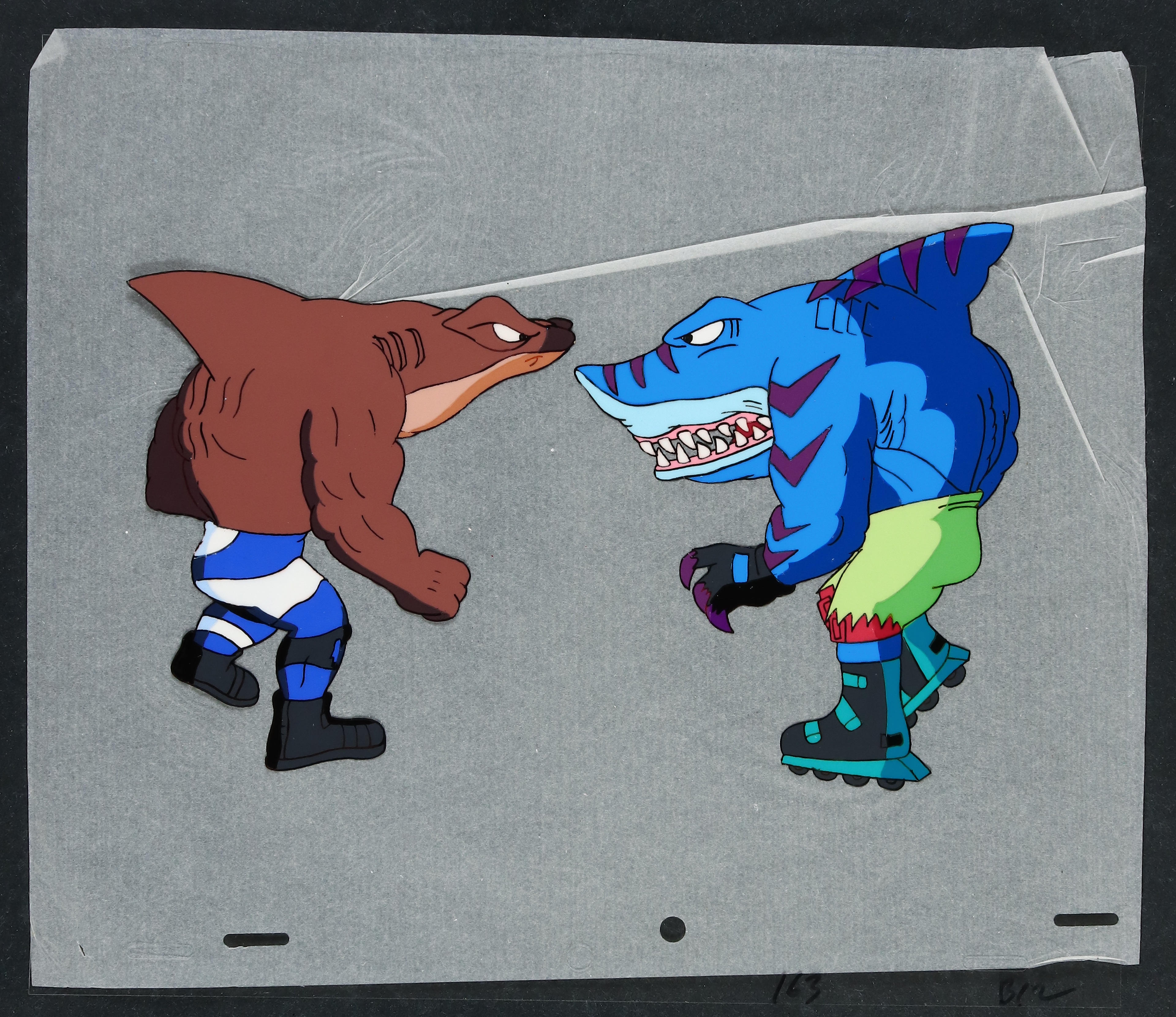 Few cartoons capture the cultural milieu of 1990's America like Street Sharks, a toy-based Saturday Morning Cartoon revolving around four brothers who are tossed into a 'Gene Slammer' and turned into human-shark hybrids. This great cel features full figure images of Streex and Jab, the "cool" one and the "lazy" one respectively. Paint on the reverse of a 10 1/2" x 9" cel. A protective sheet of tissue paper is partially affixed to the reverse, but can be carefully removed if desired.