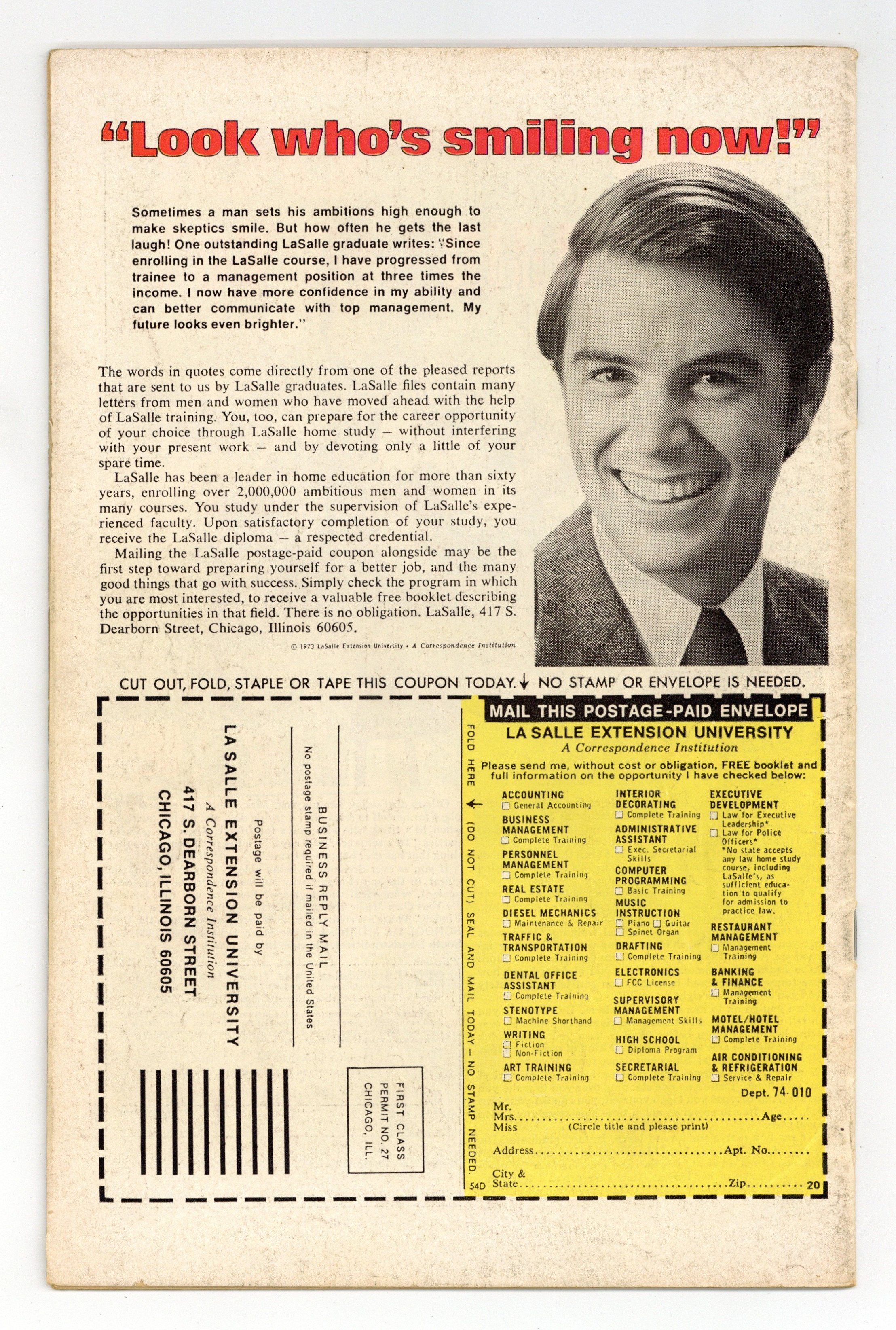 Starts Jan 19 Cover pencils by John Buscema. The Torch is Passed...!, script by Roy Thomas and Stan Lee, pencils by George Tuska and Steve Ditko, inks by John Tartaglione; The X-Men attend Professor X's funeral and are surprised when Quicksilver shows up; Returning to the mansion, the X-Men are greeted by a posthumous message from Xavier passing the torch on to his students; Quicksilver returns to Magneto's lair and is plagied with doubt about leaving the Avengers to rejoin his old master but fears for his sister's health; The X-Men lay a trap and attack Magneto and his Brotherhood but the bad guys quickly gain the upper hand; reprinted from issue 42. Journey's End, script by Stan Lee, art by Steve Ditko; A crook ends up killing a night watchman and flees into the past in a time machine where he has a violent encounter with the machine's creator; reprinted from Amazing Adult Fantasy #7. 36 pgs. $0.25. Cover price $0.25.