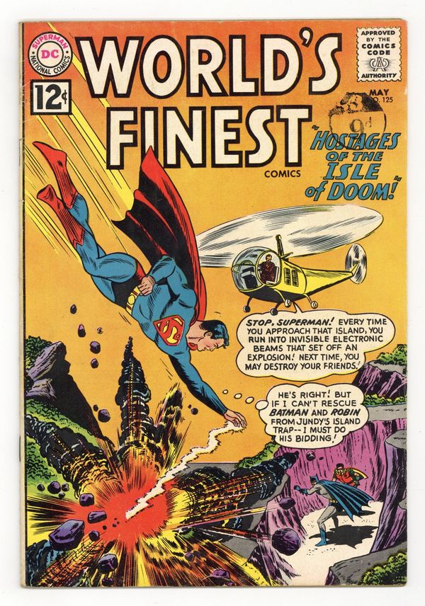 Starts Jan 26 Cover pencils by Dick Dillin, inks by Sheldon Moldoff. The Hostages of the Island of Doom starring Superman and Batman, script by Jerry Coleman, art by Jim Mooney; Jundy kidnaps Batman and Robin and transports them to his Island of Doom where he threatens to kill them unless Superman finds all the parts of an ancient magic scepter for him. Homer humor page by Henry Boltinoff. The Man Who Defied Death starring Green Arrow, script by Ed Herron, art by Lee Elias; Fred Jenkins will take any job no matter how dangerous to raise money for his son's operation. Aquaman's Super Sidekick, script by Jack Miller, art by Nick Cardy; Aquaman pretends Aqualad has super powers to protect him from criminals. 36 Pages, Full Color. Cover price $0.12.
