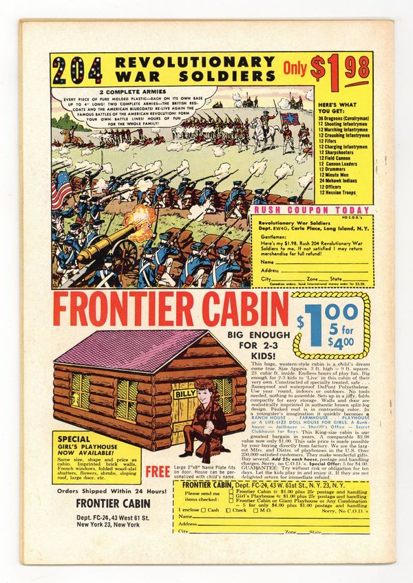 Ends Jan 12 10:08 PM CST Bid History 20 bids Current Bid $221 Your Secret Max Bid If you'd like to bid, please log in or register. Cover art by Win Mortimer. Daddy Superman, pencils by Wayne Boring; Twin babies are accidentally left on Clark Kent's doorstep. The Freedom Press starring Tomahawk, Tom Paine, and Ben Franklin, art by Fred Ray. The Bravest Man In The World starring Boy Commandos, script by George Kashdan, pencils by Curt Swan. The Bow Fails Green Arrow starring Green Arrow, script by George Kashdan, art by George Papp. The Tattooed Crook starring Zatara, script by Joe Samachson, art by William F. White. Crime By The Book starring Batman and Penguin, script by Edmond Hamilton, pencils by Bob Kane, inks by Ray Burnley. One-page Tootsie Roll ad, Captain Tootsie Traps the Circus Culprit by C.C. Beck. 76 Pages, Full Color. Cover price $0.15.