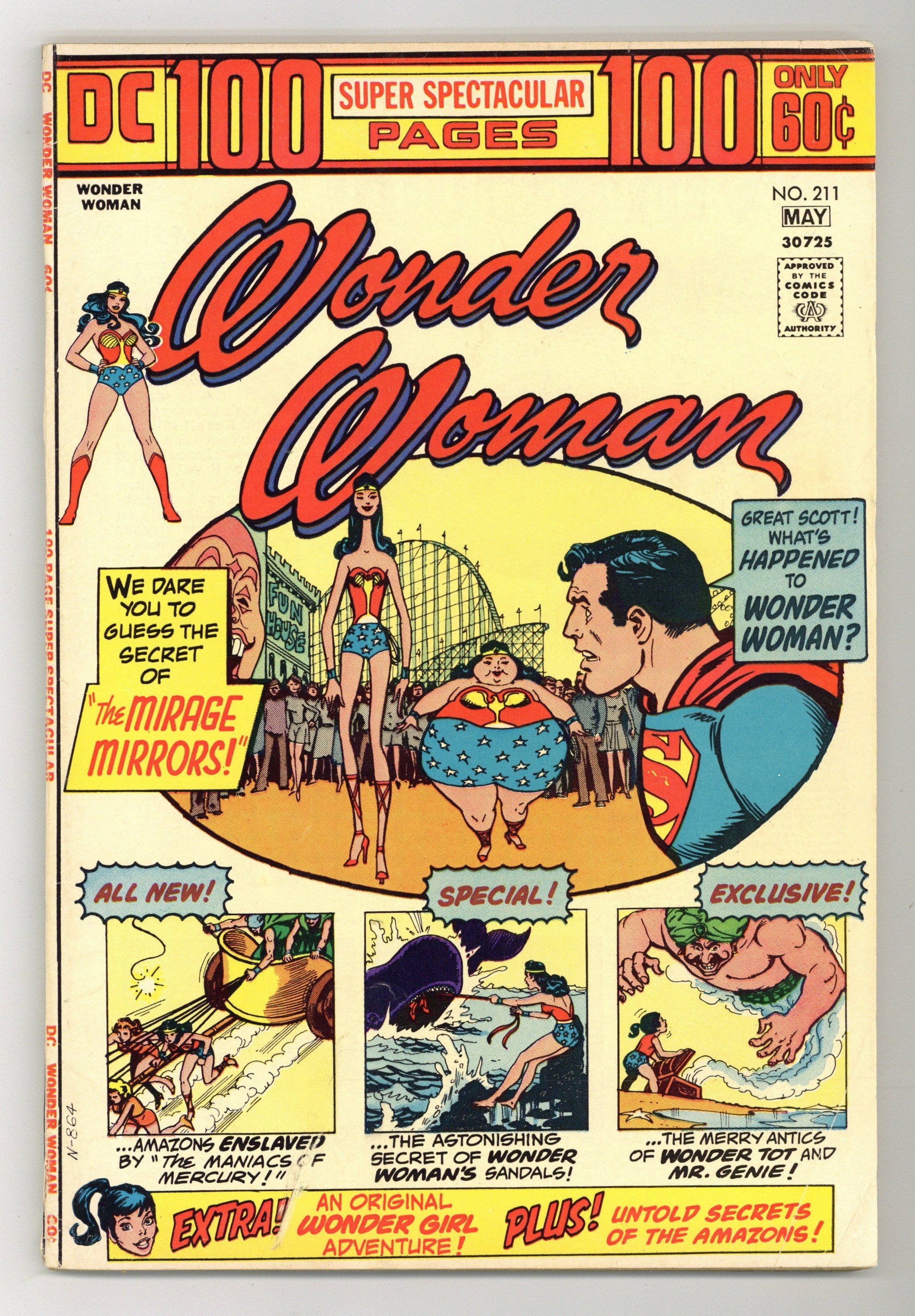 Starts Jan 26 100-page giant. Cover by Nick Cardy. New stories: "The Maniacs of Mercury," script by Robert Kanigher, pencils by Ric Estrada, inks by Vince Colletta; When a space mission in Wonder Womans robot plane goes awry, the heroine saves herself and two sister Amazons from falling into the sun by diverting their course to land them on Mercury; There they become prisoners of the giant Mercurian males, led by King Celerito, who have enslaved all their women; Rehash of Wonder Woman #26, "Speed Maniacs from Mercury." Reprints: "The Origin of the Amazon Plane!", script by Robert Kanigher, art by Harry G. Peter; Wonder Woman discovers a miniature sun in the crater of an atomic bomb test and recovers it for study in Paradise Island; The Amazons discover that an atom of uranium from the sun is really a miniature planet, controlled by female "protons" led by Queen Atomia. "Wonder Woman Amazon Teen-Ager!", script by Robert Kanigher, pencils by Ross Andru, inks by Mike Esposito; Origin of Wonder Girl's costume. "The Winning of Wonder Woman's Tiara!", script by Robert Kanigher, art by Harry G. Peter. "Wonder Tot and Mister Genie!", script by Robert Kanigher, pencils by Ross Andru, inks by Mike Esposito. "The Secret of Wonder Woman's Sandals!", script by Robert Kanigher, art by Harry G. Peter. "The Mirage Mirrors!", script by Robert Kanigher, pencils by Ross Andru, inks by Mike Esposito. Statement of ownership - average print run 313,000; average paid circulation 145,054. 100 pages, Full Color. Cover price $0.60.