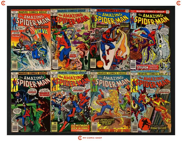 Issues 167, 169, 176, 178PIZ, 180-183 of Amazing Spider-Man (1963 1st Series) and issue 179 of Amazing Spider-Man (1963 1st Series) Whitman Variants. Most will grade in the VG to FN range with #167 grading GD.