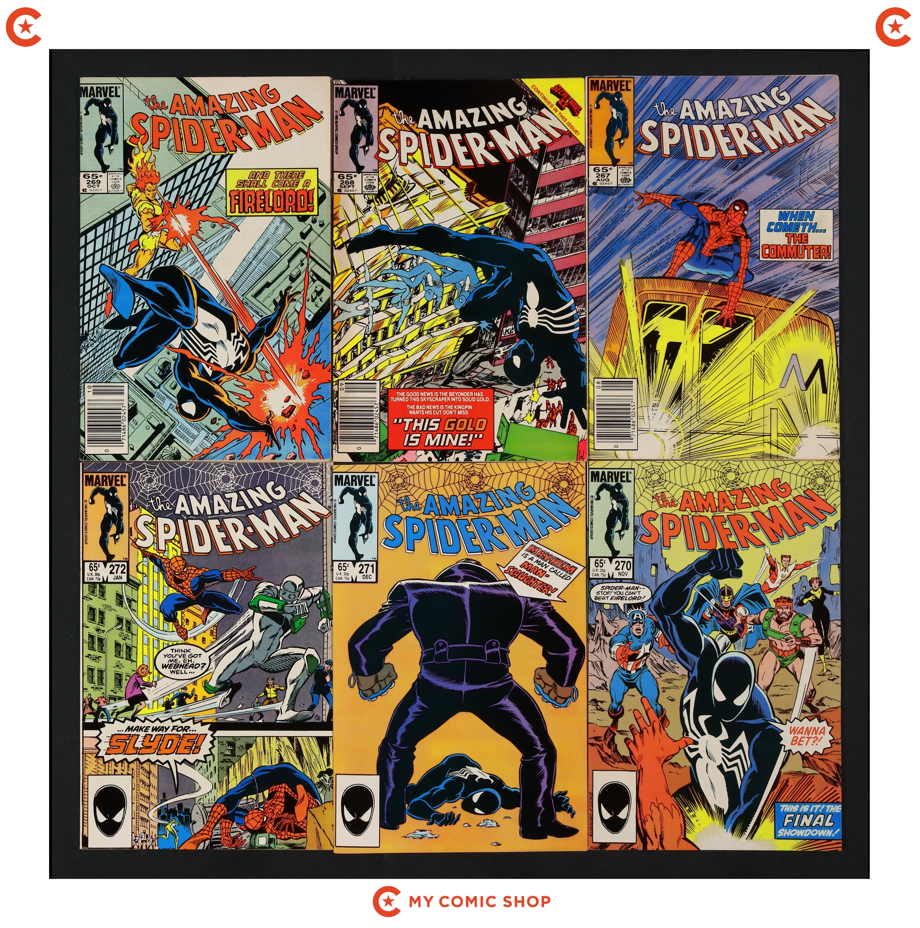 Issues 267, 268, 269N, 270D-273D, 274, and 275 of Amazing Spider-Man (1963 1st Series). Most will grade in the FN to VG range with a couple grading closer to VF.