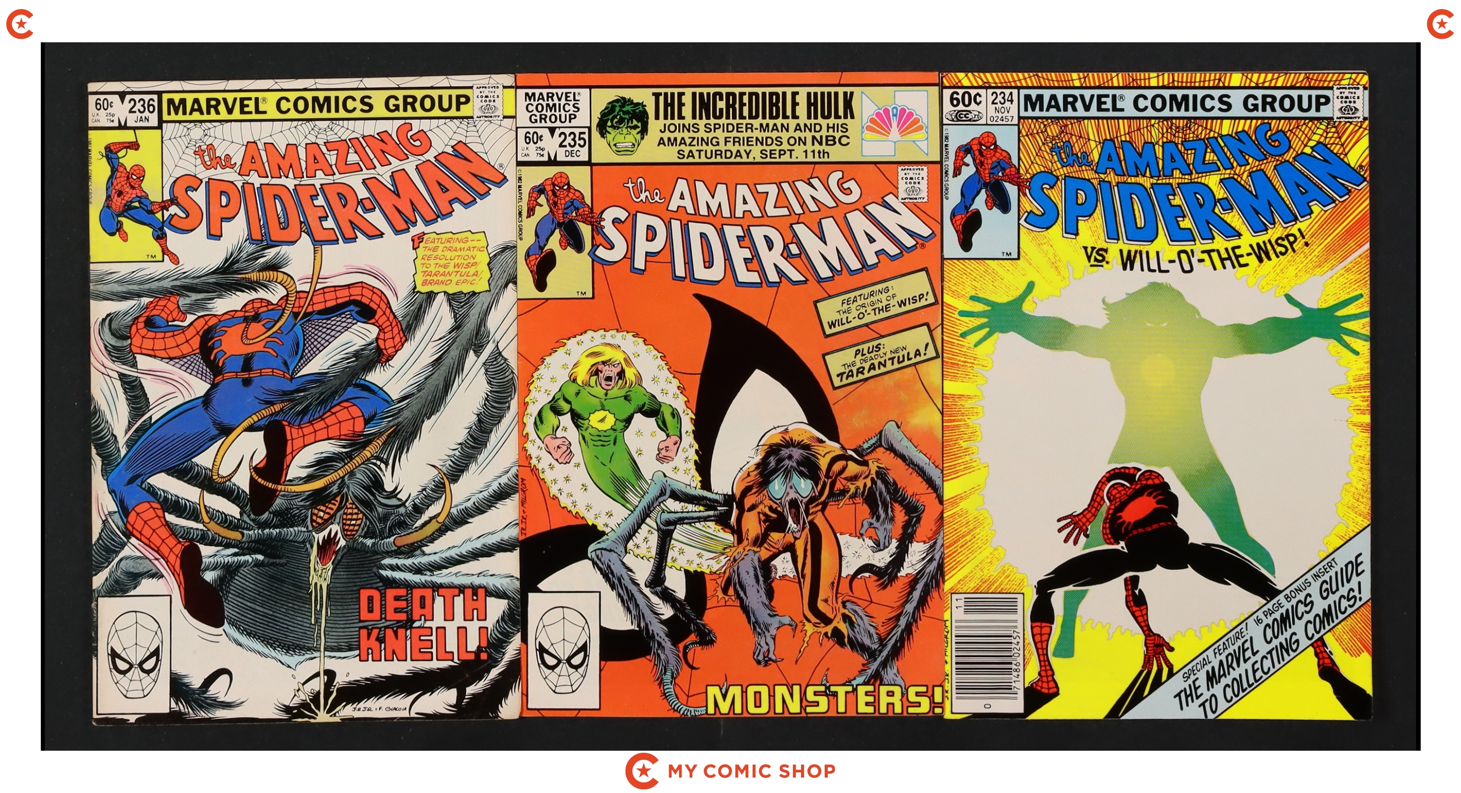 Issues 223N, 228N, 231N, 232, 233N, 234, 235, 245, 250N of Amazing Spider-Man (1963 1st Series). Most will grade in the VG to FN range.