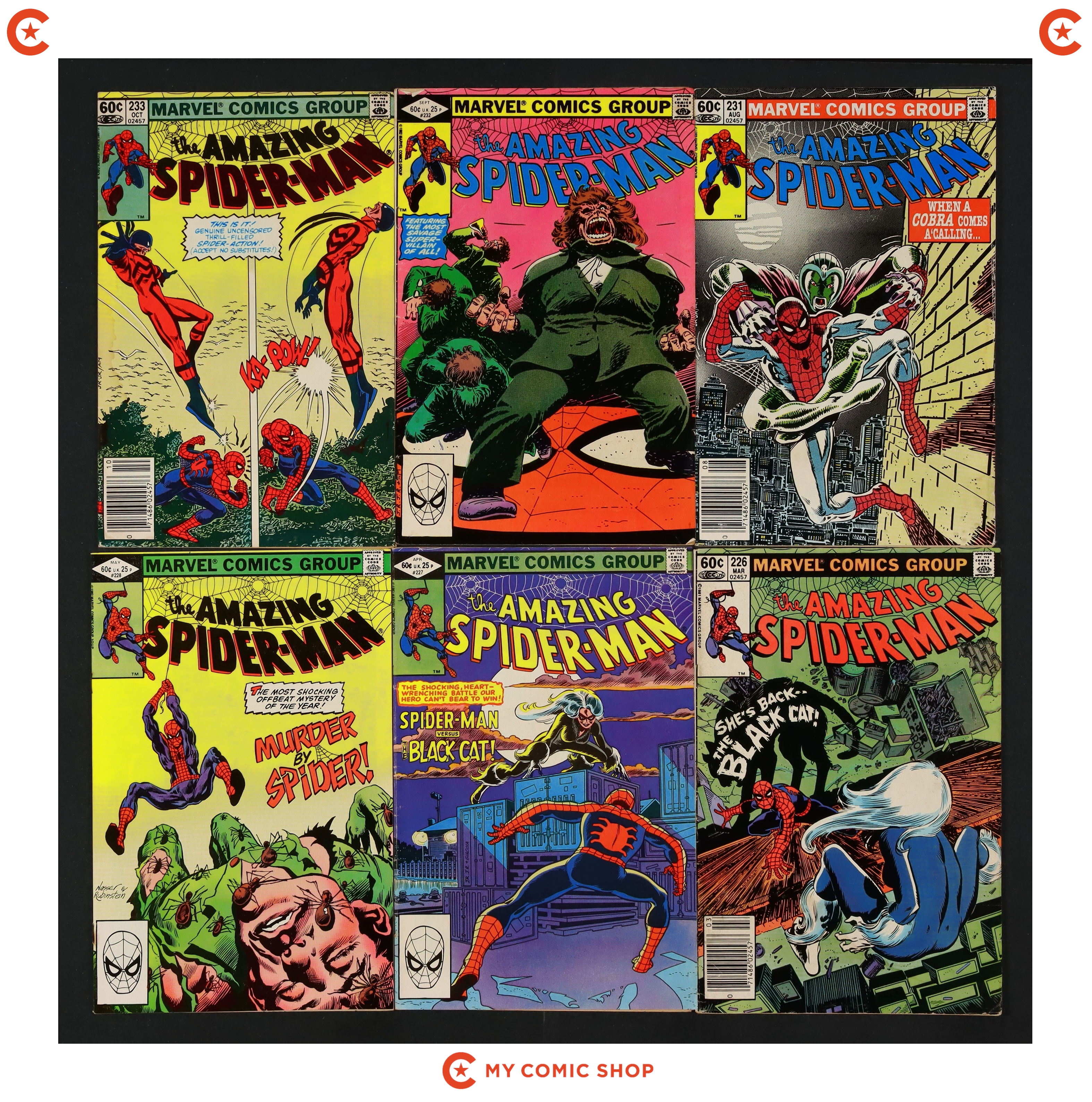 Issues 226N, 227D, 228D, 231N, 232, 233N, 234N, 235D, and 236 of Amazing Spider-Man (1963 1st Series). Most will grade in the FN to VG range with a couple grading GD.