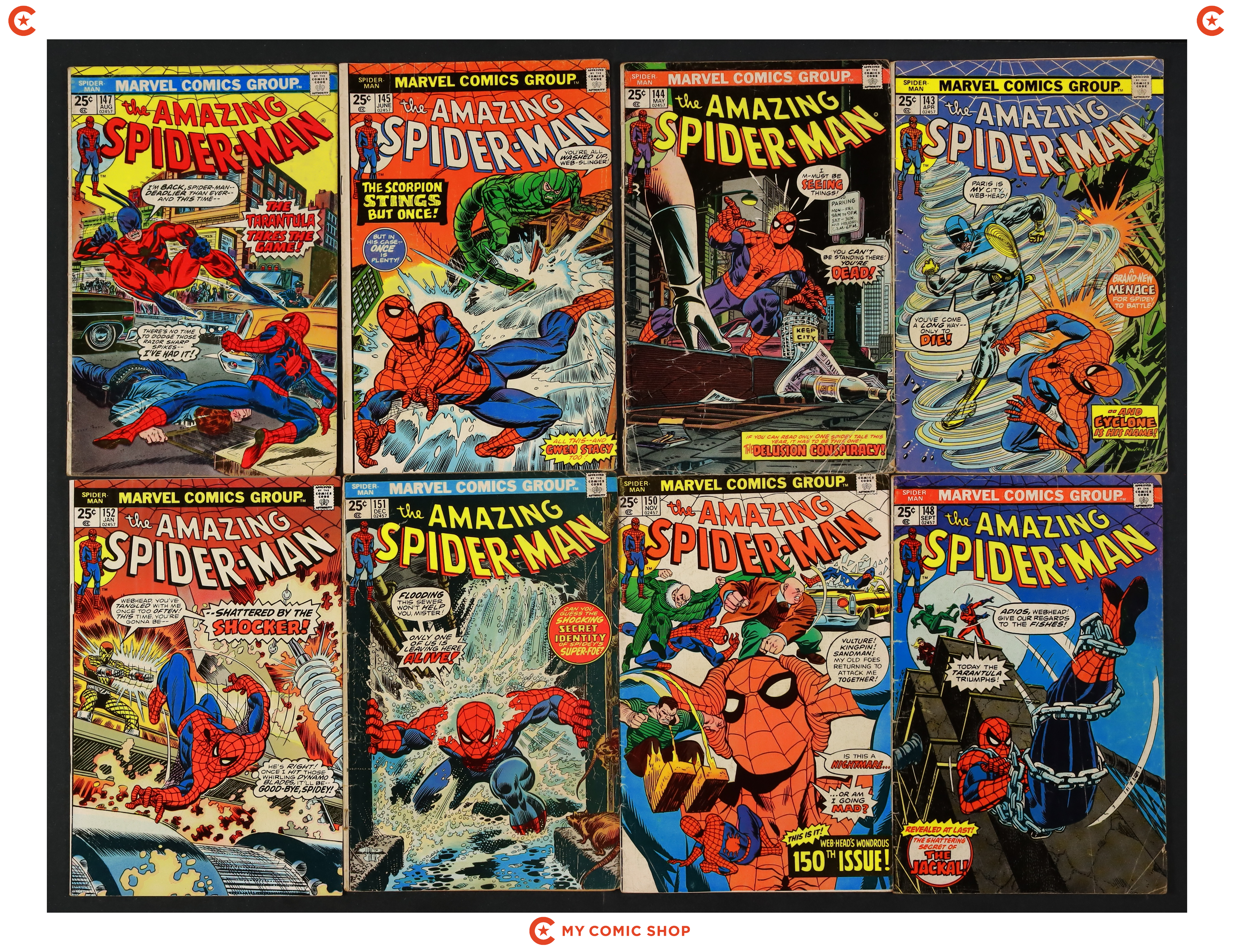 Issues 143-145, 147, 148, 150-152 of Amazing Spider-Man (1963 1st Series). Most will grade in the FR/GD to GD/VG range, with 147 grading at PR (INCOMPLETE. Marvel Value stamp removed).