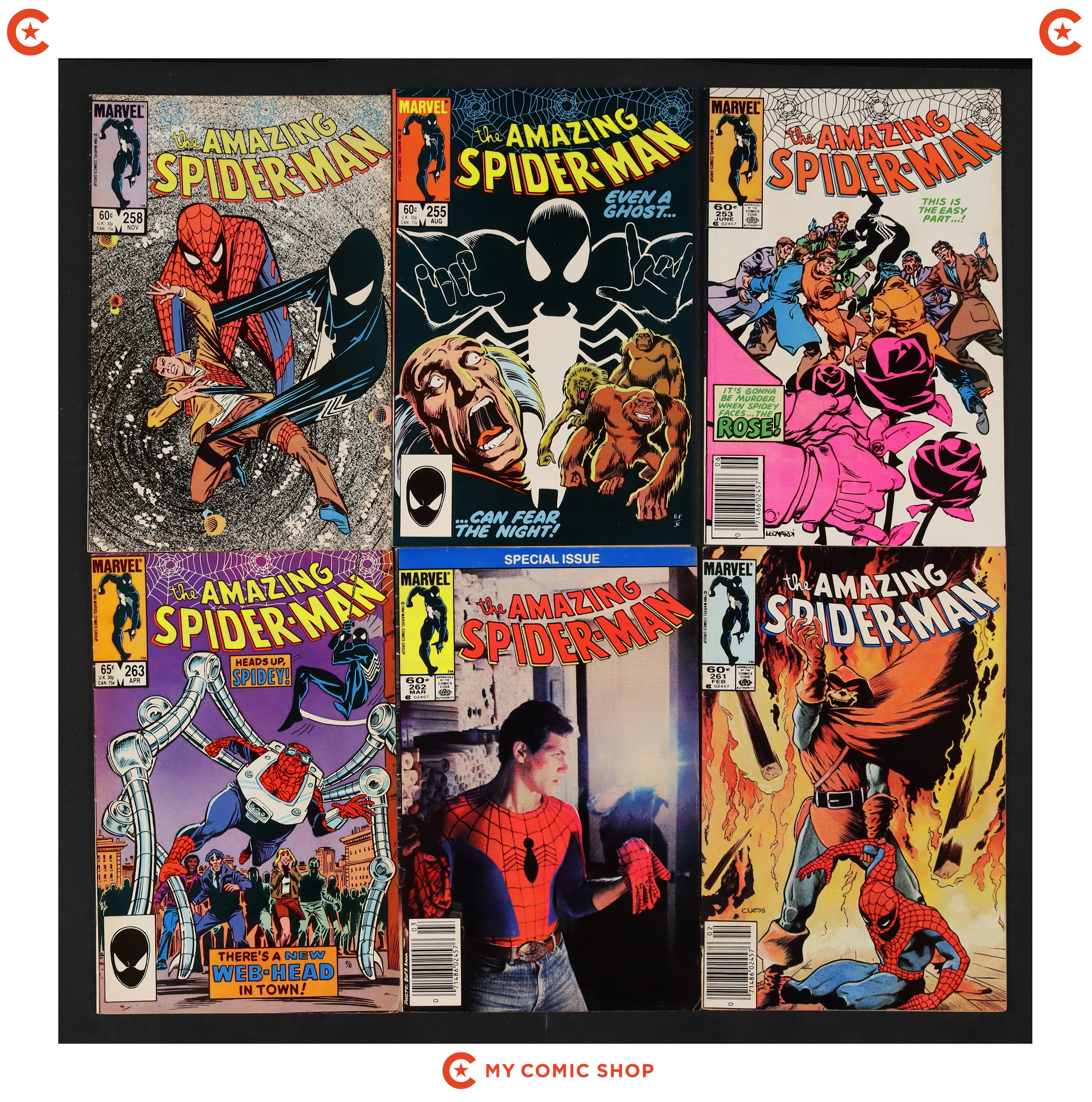 Issues 253N, 254N, 255D, 256N, 257N, 259, 260N, 261D, 262D of Amazing Spider-Man (1963 1st Series). Most will grade in the VG to FN range.