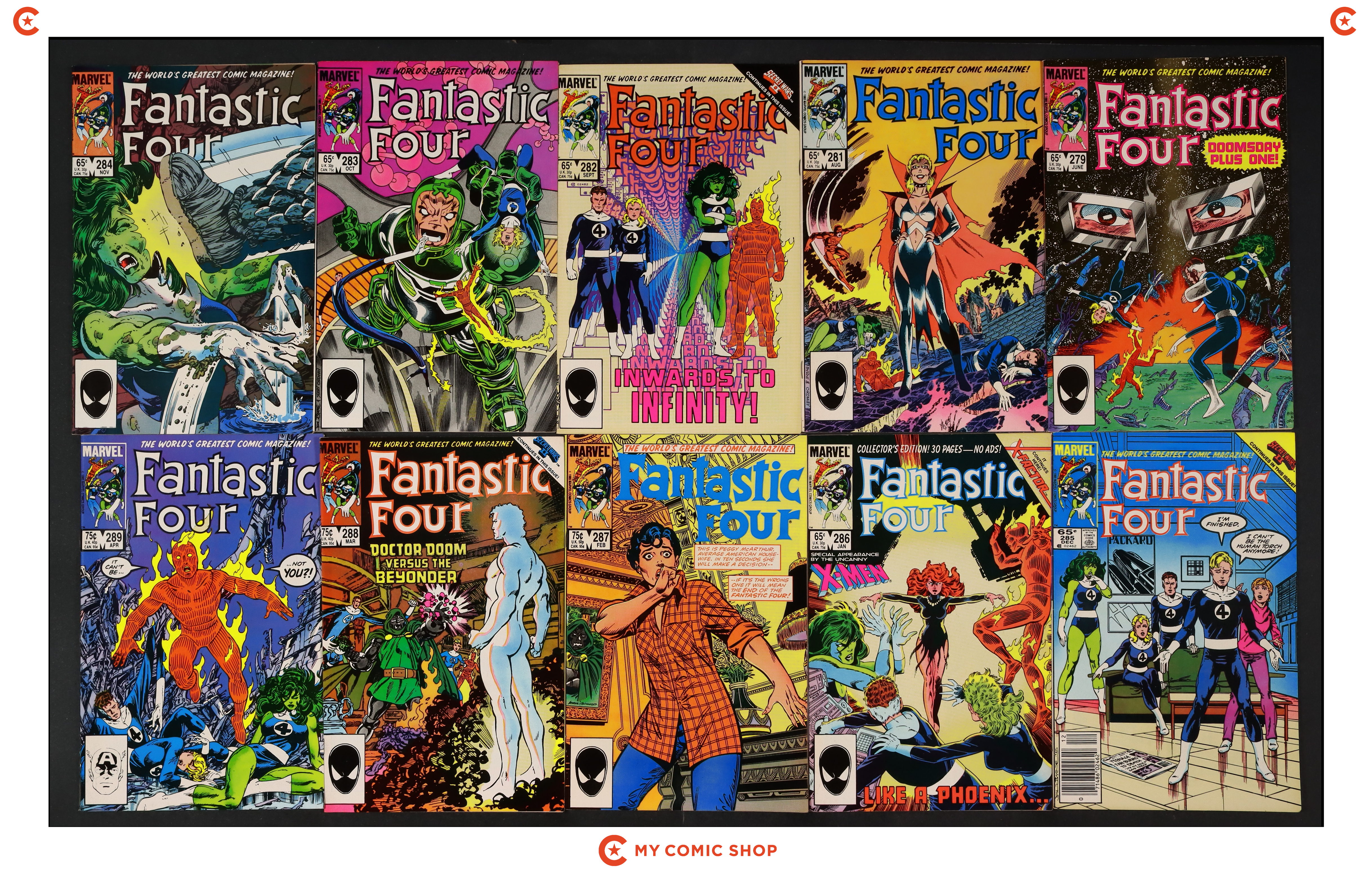 Issues 279D, 281-286, 287D, 288, and 289 of Fantastic Four (1961 1st Series). Most will grade in the VF- to FN range.