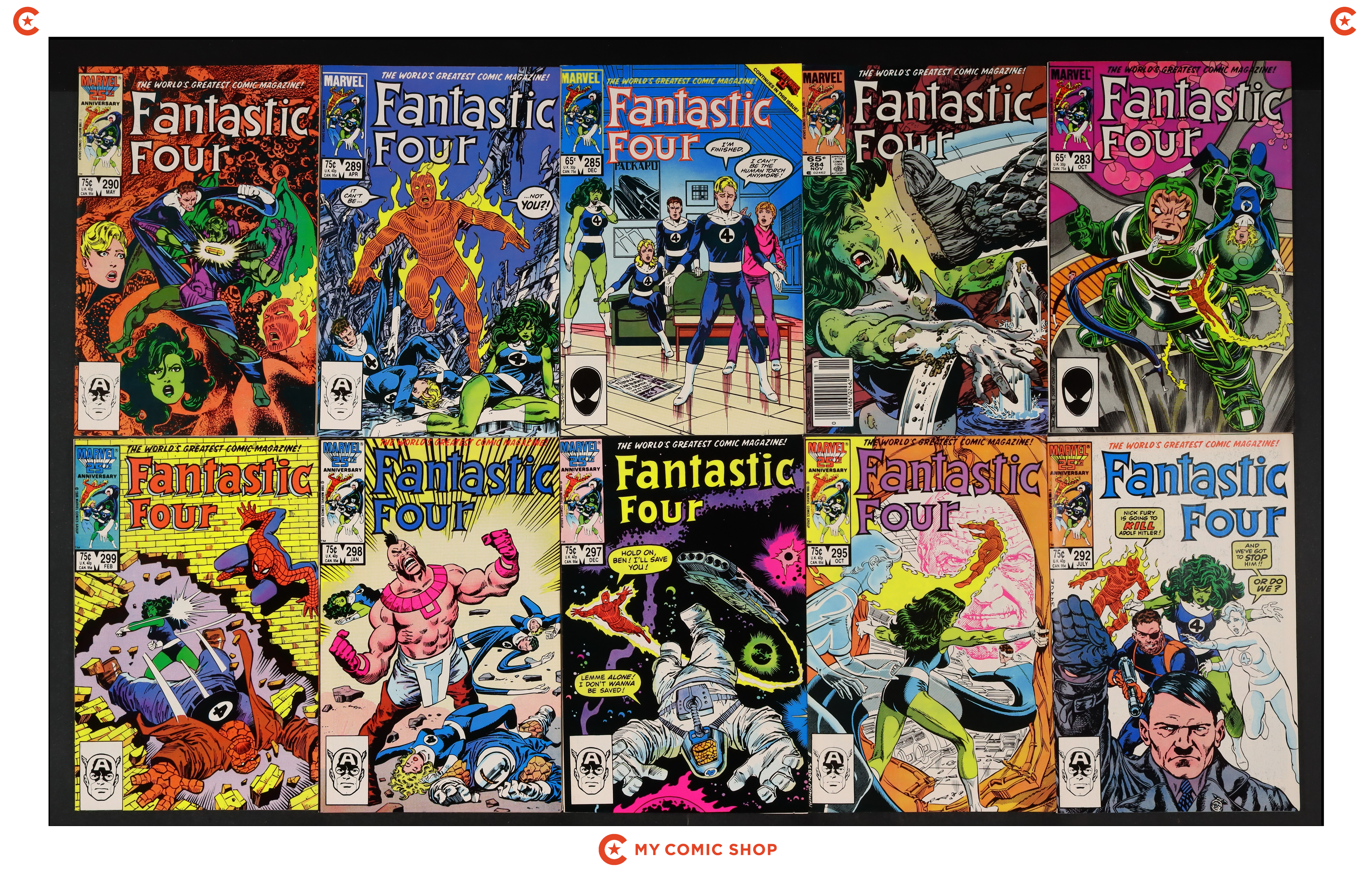 Issues 283-285, 289, 290, 292D, 295, 297, 298D, 299 of Fantastic Four (1961 1st Series). Most will grade in the VG/FN to VF- range.