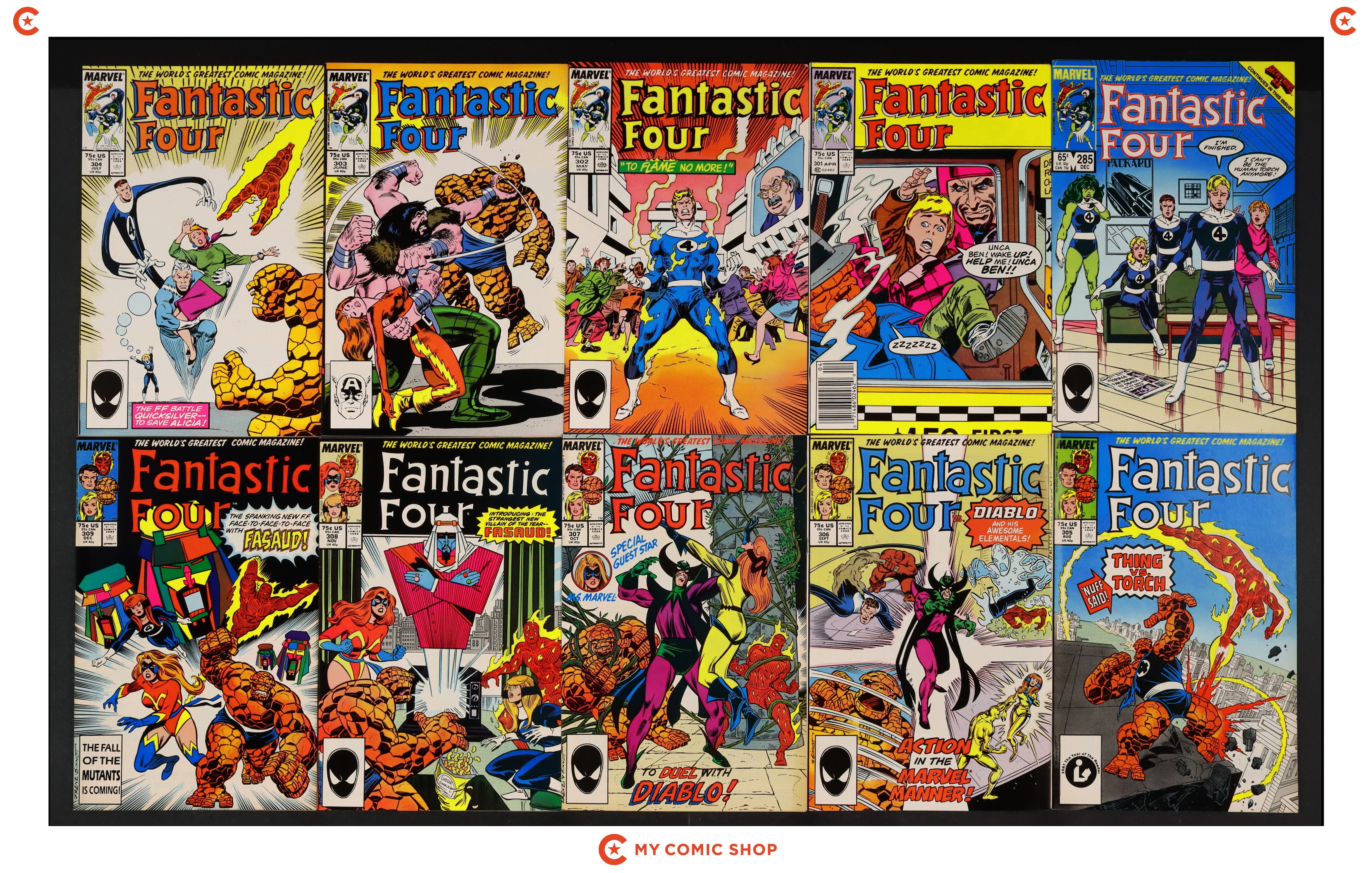 Issues 285, 301-305, 306D, 307D, 308, 309 of Fantastic Four (1961 1st Series). Most will grade in the FN- to VF+ range.