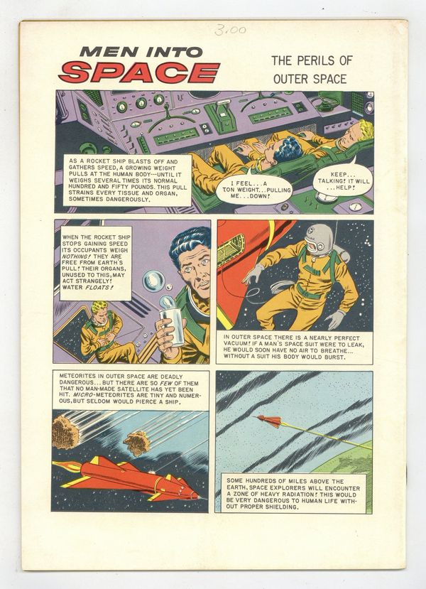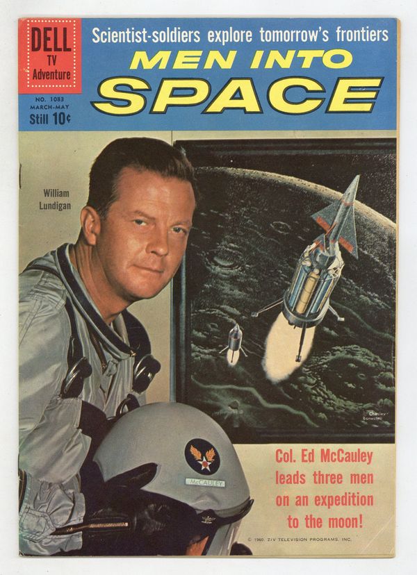 Starts Feb 2 Variant with "The Perils of Outer Space" comic filler on back cover. Indicia title is "MEN INTO SPACE, No. 1083." Based on the CBS TV series "Men Into Space." Cover photo of Col. Ed McCauley (William Lundigan). Space Probe; Col. Ed McCauley heads the three-man crew making the first manned flight into outer space; Due to a malfunction of the second stage they must make repairs in space. Moon Landing; Col. McCauley heads the first manned landing on the moon; He and three crewman explore a crater, but a moonquake causes a boulder to fall and injure crewman Gilman. The Dust and the Depths; The three remaining spacemen explore a nearby mountain range. Facts about the moon. Perils of Outer Space. All scripts by Gaylord Du Bois, art by Murphy Anderson. All art by Phil de Lara. 36 pages, full color. Cover price $0.10.