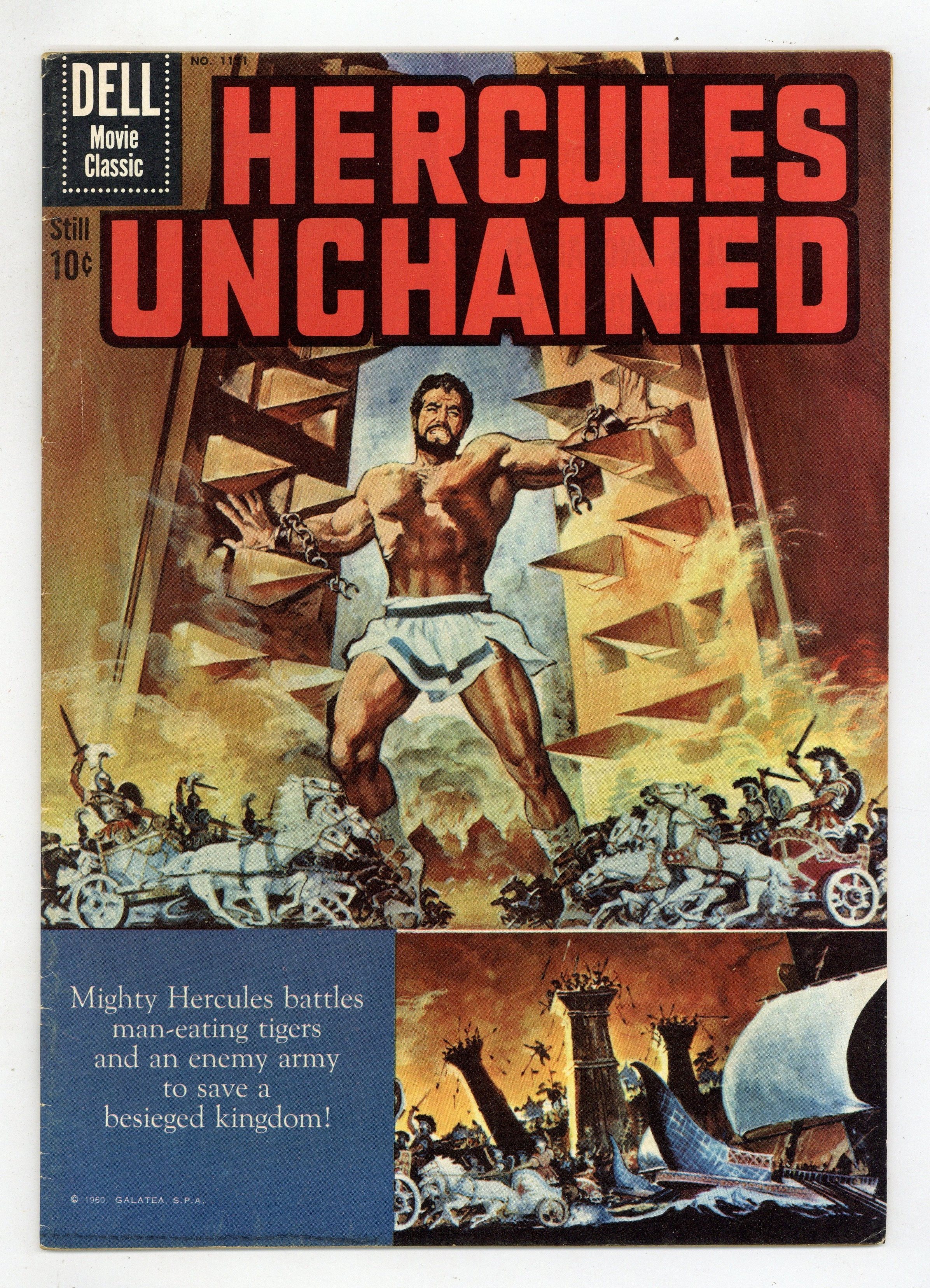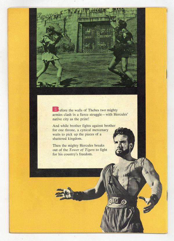 Starts Feb 2 Photo back cover. Hercules Unchained movie adaptation. Reed Crandall/George Evans art. Steve Reeves photos from the movie on the inside front cover. Painted cover. 36 pages, full color. Cover price $0.10.