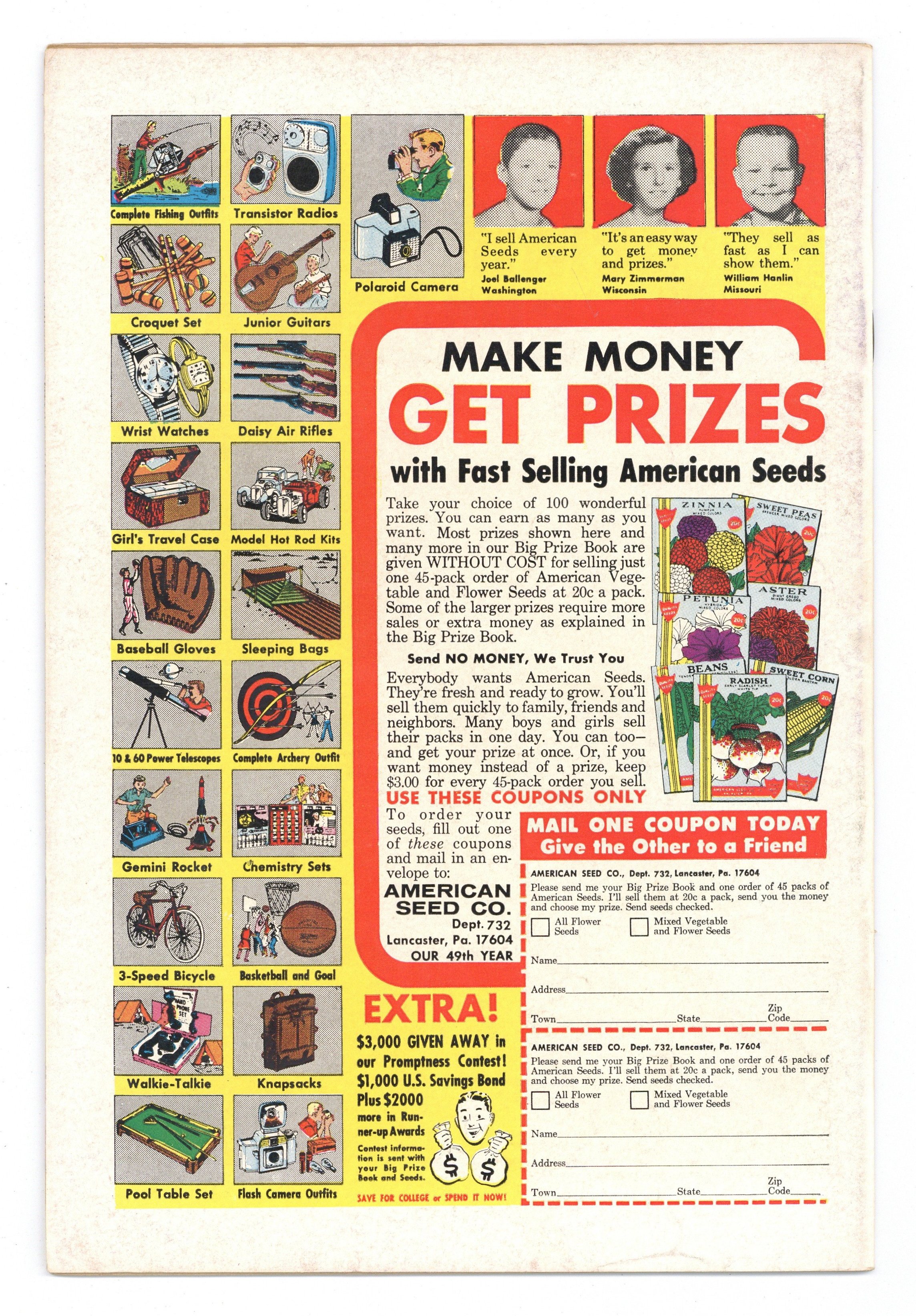 Starts Jan 26 Cover art by Gil Kane. The Jailing of Hal Jordan!, script by Gardner Fox, pencils by Gil Kane, inks by Sid Greene; Hal Jordan foils a bank robbery by the Triple Plays, but the fourth man they added for the job, Pete Claypool, completes the robbery; Pete later inherits a fortune and becomes smitten with Carol Ferris after moving next door, where he frames Hal for the robbery in an attempt to remove his romantic competition, but Hal forces Pete to confess to the police. Best Power Ring Wishes, Green Lantern illustration by Gil Kane. The End of a Gladiator!, script by John Broome, pencils by Gil Kane, inks by Sid Greene; he Guardians bring Hal Jordan's body to Oa after he appears to be killed in a battle with Dr. Polaris, while using his rings power reserve to save Tom Kalmaku. This issue also contains a statment of ownership--average print run 426,000; average paid circulation 269,000. Cover price $0.12.