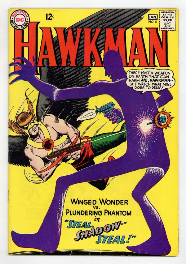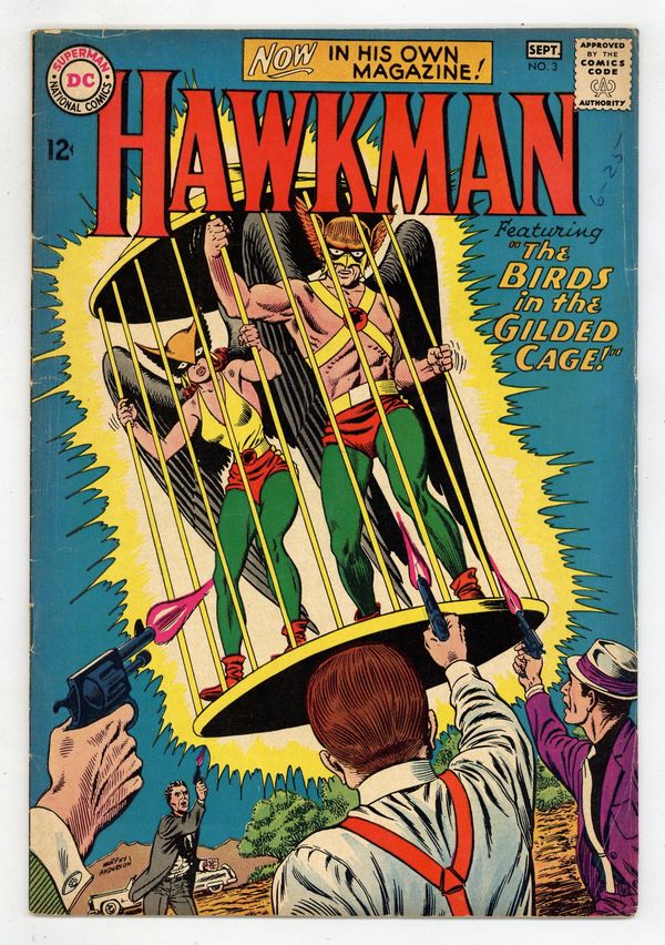 Starts Feb 2 Cover art by Murphy Anderson. The Fear that Haunted Hawkman, script by Gardner Fox, art by Murphy Anderson; An ancient Eqyptian statue mysteriously causes Hawkman to fear the leader of the Sky-Raiders. Birds In the Gilded Cage, script by Gardner Fox, art by Murphy Anderson; An alien bird-creature misunderstands the Hawks' work as crimefighters and imprisons them in a cage to "protect" them from a gang of crooks. Letter to the editor from comics artist Bill Stout. 36 pgs. $0.12. Cover price $0.12.