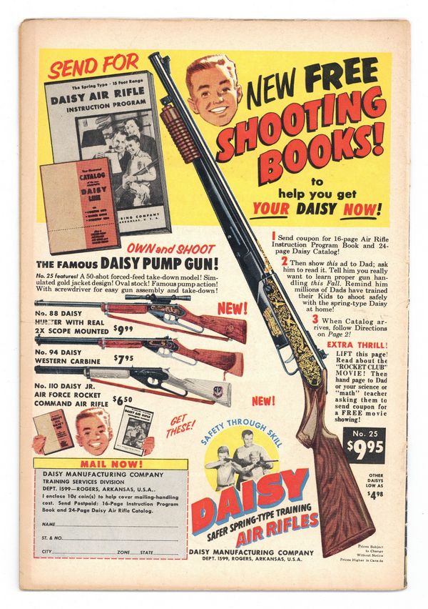 Starts Feb 2 Cover by Nick Cardy and Jack Adler. Featuring: 8 page story "I Fought the Molten Monster" drawn by Howard Purcell; 1 page public service announcement "The Atom Servant of Man" written by Jack Schiff; 1 page The Magic Genie story by Henry Boltinoff; 7 page story "The Human Cyclotron" drawn by Mort Meskin and George Roussos; 1 page Mysteries in Space! filler; 1 page text story "The Long Night of Fear"; 7 page story "Prisoners of the Robot Factory" drawn by Nick Cardy. 36 Pages, Full Color. Cover price $0.10.