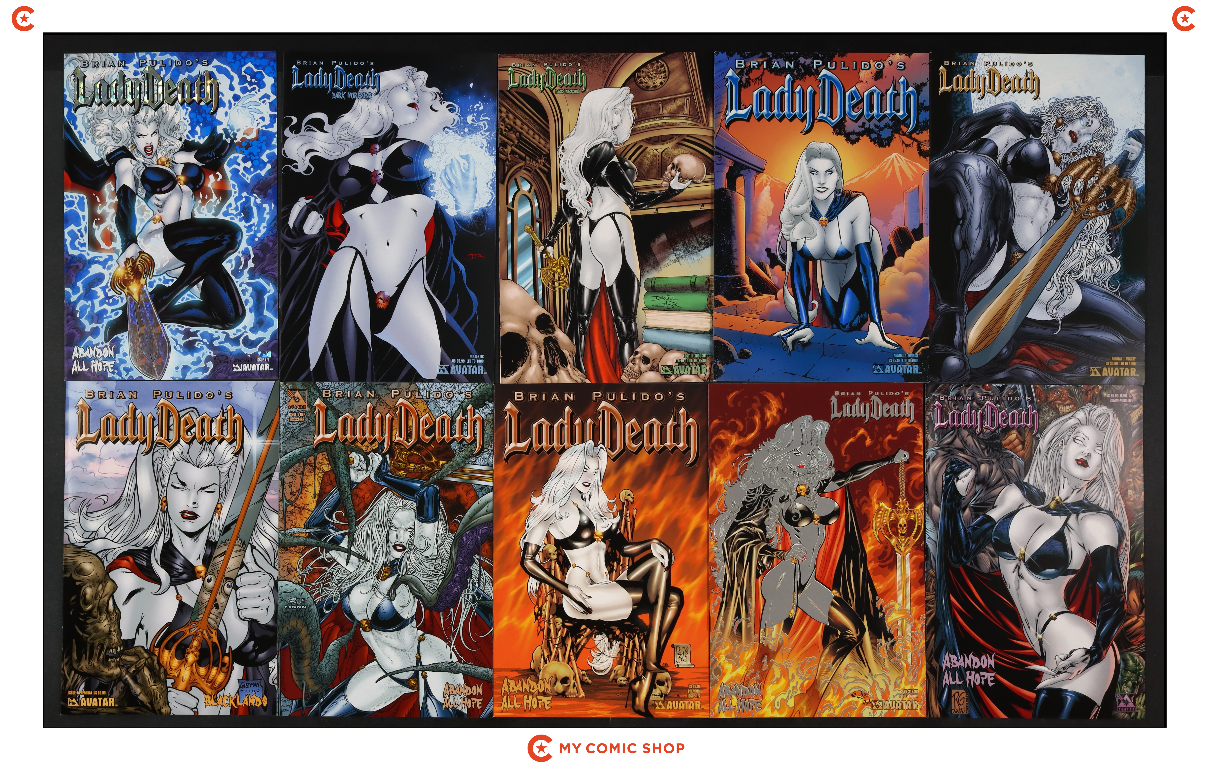 Issues Lady Death Death Goddess (2005) 1A; Lady Death Swimsuit (2005 Avatar) 2005KILLING; Lady Death Sacrilege (2006) 0A; Lady Death Infernal Sins (2006) 1E, 1M; Lady Death The Wicked (2005) 1N, 1Q, 1O; and Lady Death Lost Souls (2006 Avatar) 0WRAP, 2B, 2D, 2G. Most will grade in the VF+ to NM range.