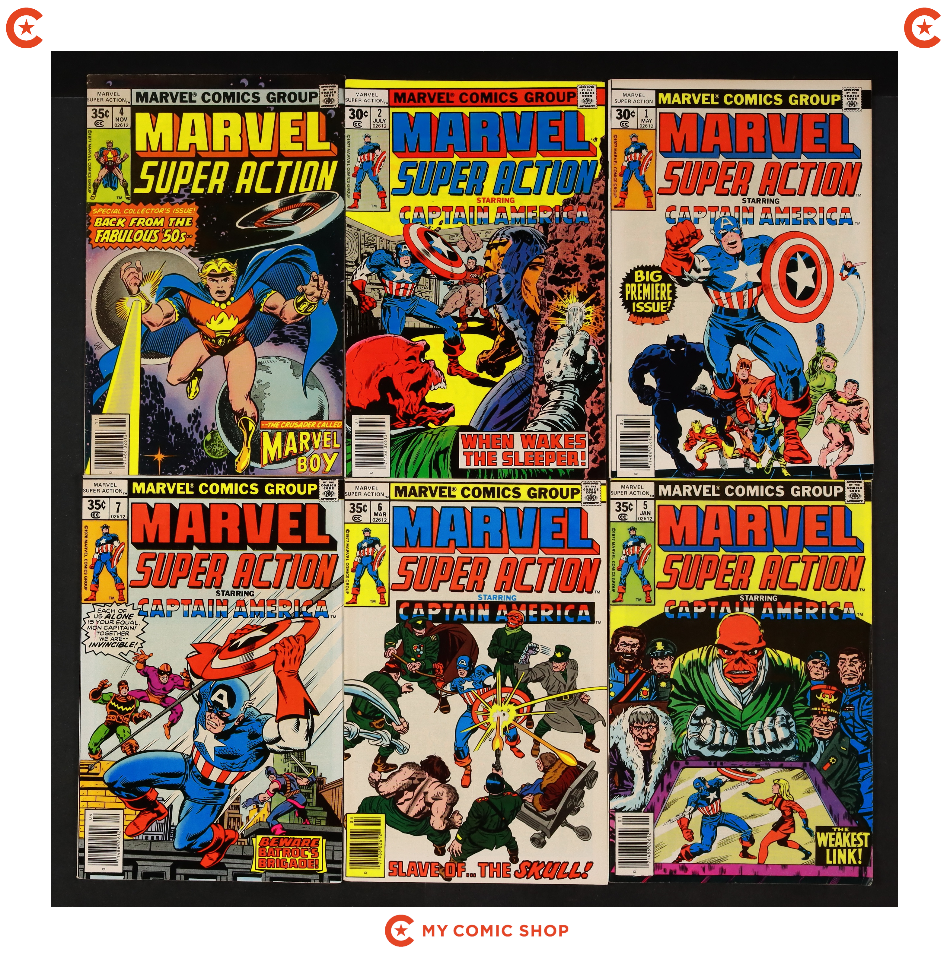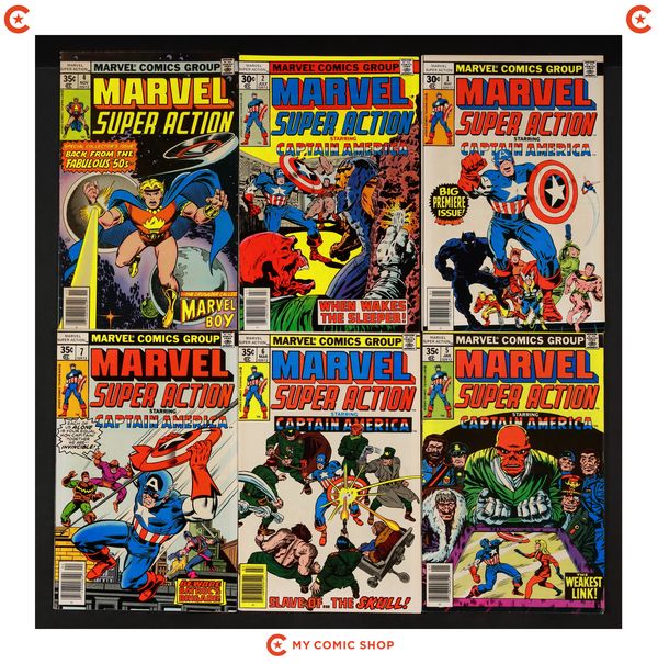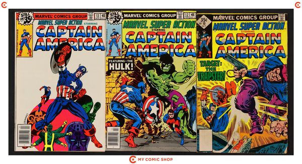 Issues 1, 2, 4-7, 12, 13 of Marvel Super Action (1977) and issues 10 of Marvel Super Action (1977) Whitman Variants. Most will grade in the VG to FN range with #10 grading GD.