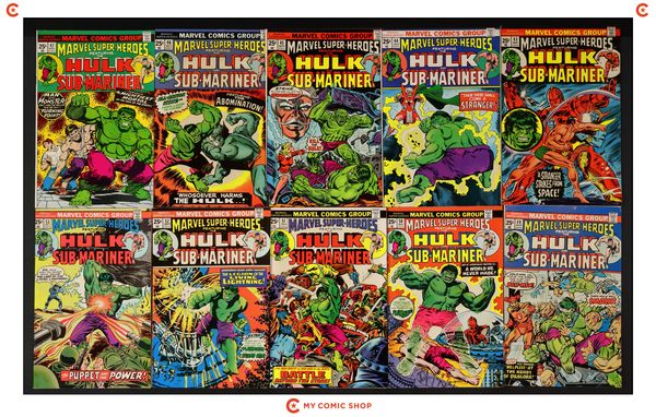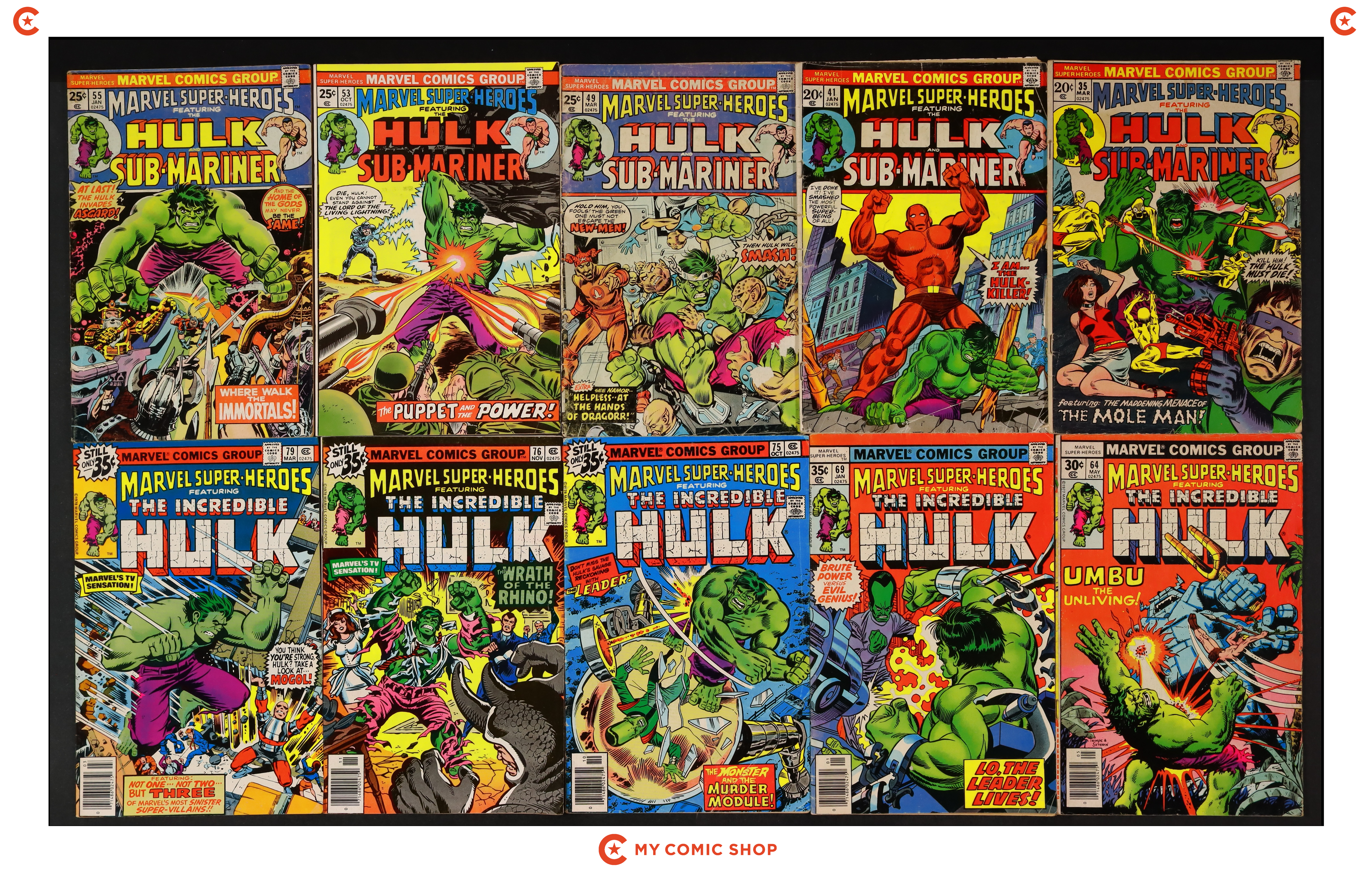 Issues 35, 41, 49, 53, 55, 64, 69, 75, 76, 79 of Marvel Super Heroes (1967 1st Series). Most will grade in the GD to VG range.