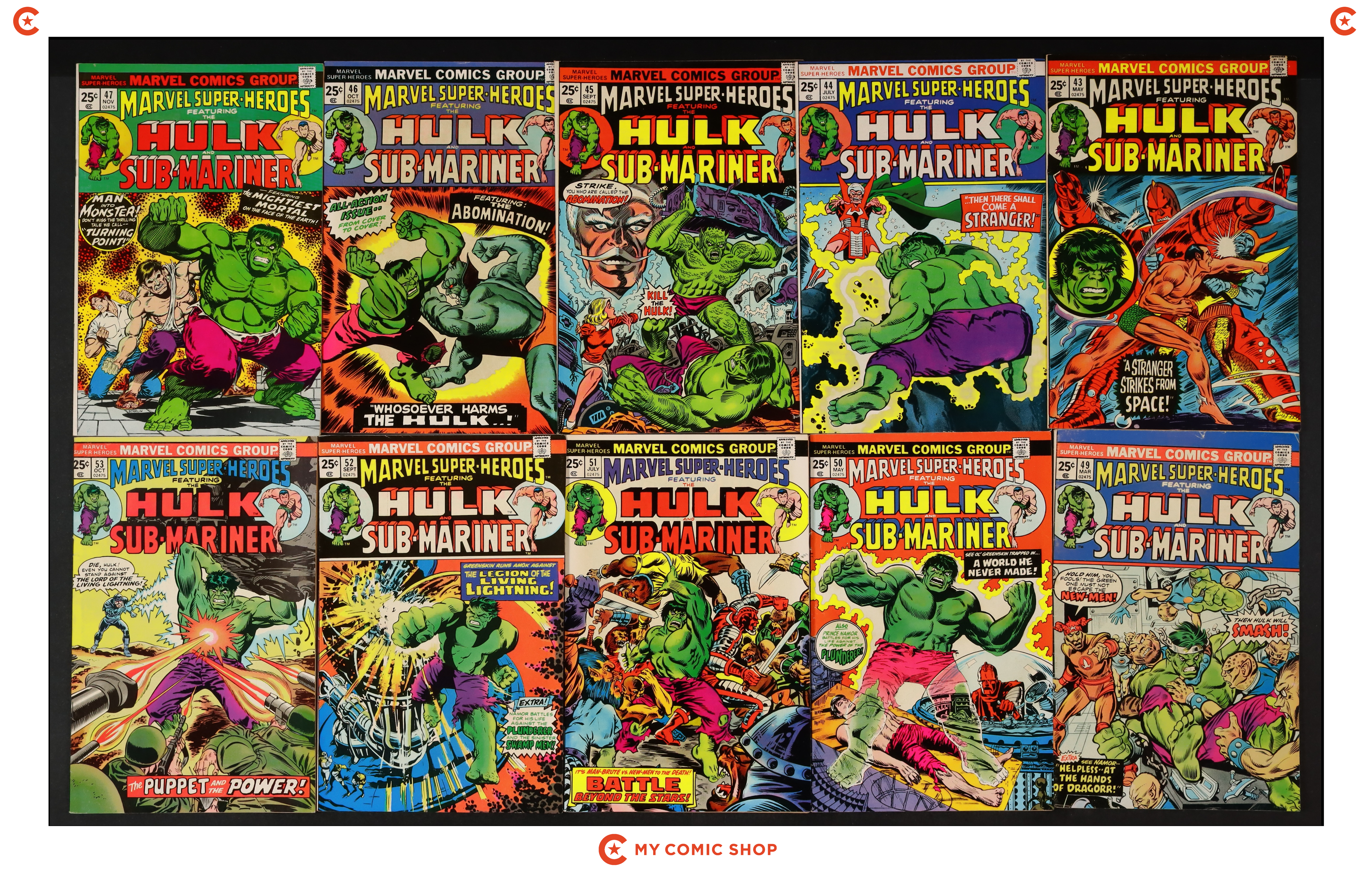 Issues 43-47, 49-53 of Marvel Super Heroes (1967 1st Series). Most will grade in the VG to FN range.