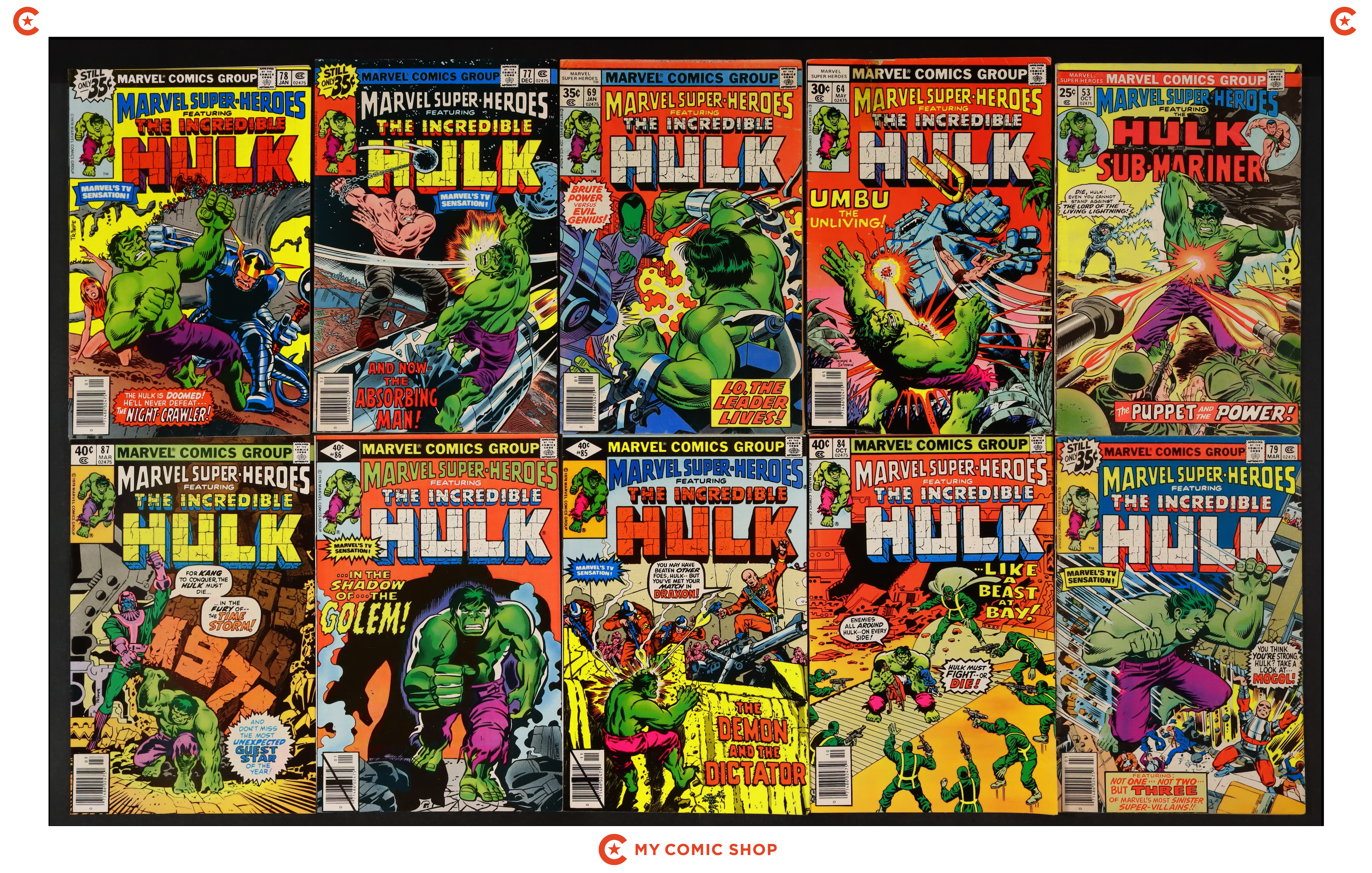 Issues 53, 64, 69, 77-79, 84-87 of Marvel Super Heroes (1967 1st Series). Most will grade in the VG to FN range with #53, #64 grading GD.