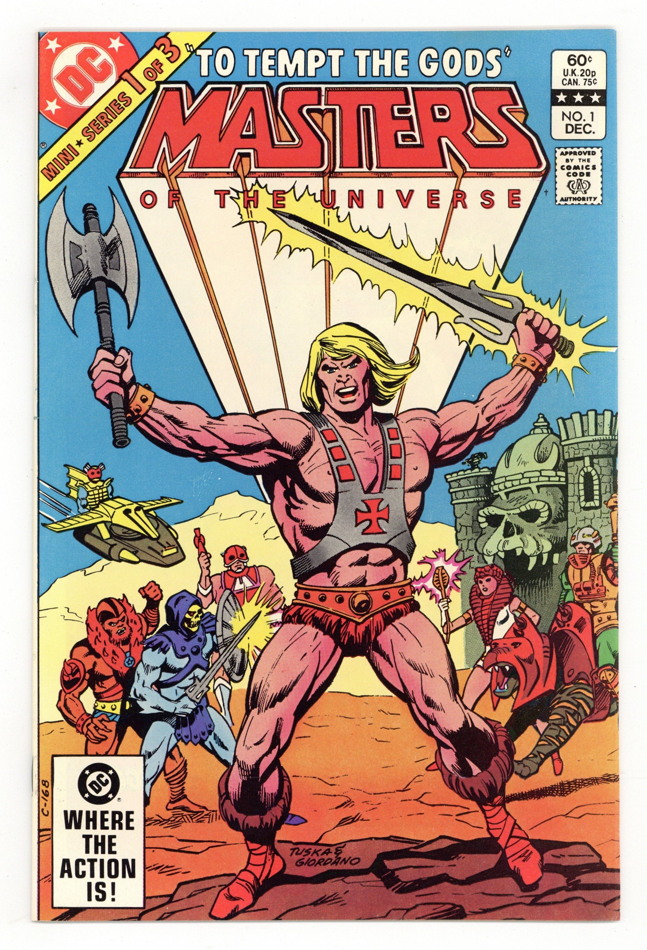 Ends Jan 15 8:47 PM CST Bid History 6 bids Current Bid $52 Your Secret Max Bid If you'd like to bid, please log in or register. Direct Edition. 'To Tempt the Gods!' Written by Paul Kupperberg. Art by George Tuska and Alfredo Alcala. Cover by George Tuska and Dick Giordano. He-Man…Battle-Cat…Man-At-Arms…Teela…Stratos… They are among the mightiest heroes on a world where science and magic meld to form a realm undreamed of. They fight a never-ending battle against the dark warlock Skeletor and his vicious horde of mutants and sorcerers. They fight for the power of Castle Grayskull, an ancient citadel that stands at the apex of time and space. For who should ever hold the power will truly be the Masters of the Universe! 32 pages, FC. Cover price $0.60.