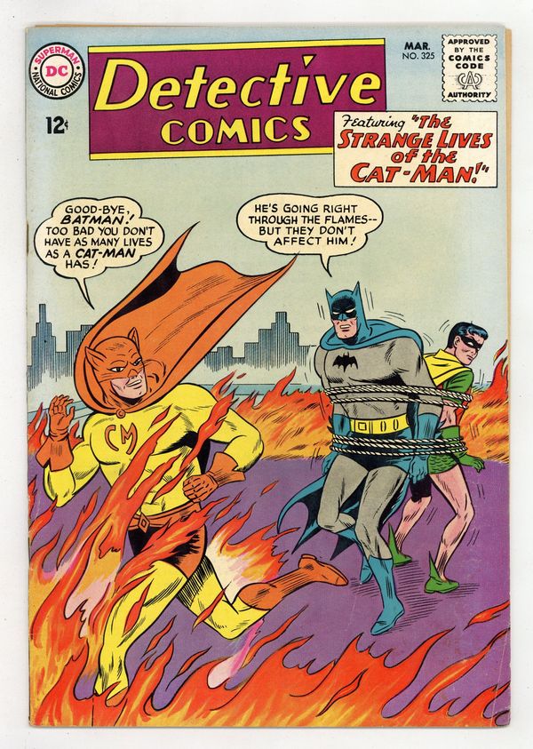 Starts Jan 19 Cover art by Sheldon Moldoff. "The Strange Lives of the Cat-Man" starring Batman, Robin, and Catwoman, pencils by Sheldon Moldoff, inks by Charles Paris; The Cat-Man returns from another apparent death, and Batman and Robin learn that the orange portions of his costume are made from a magic cloth that endows the wearer with nine lives; The feline felon thinks that he can use up six more lives, but Batwoman uses the Cat-Woman costume to put herself in peril and steal several more lives from him; Without more chances to risk his life available, Cat-Man is unable to escape from the Dynamic Duo and he is finally arrested. "The Hero of 500 B.C." starring John Jones Manhunter from Mars, script by Jack Miller, art by Joe Certa; Jonn Jonzz is accidentally thrown back in time by a time-machine activated when he is battling crooks out to take it away from its inventor, Prof. Haggard; He finds himself in Greece in the year 500 B.C.; There he rescues Dion, a Greek who is endangered by a magic cloud while performing a certain task, one of three he must do in order to win the hand of Lydia, daughter of King Delos. "The Dream Car" text story. Give and Take public service announcement, script by Jack Schiff, art by Sheldon Moldoff. 36 pgs., full color. Cover price $0.12.