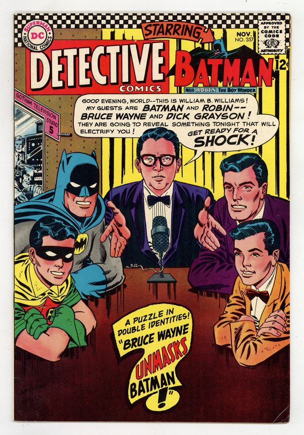 Starts Jan 19 Written by John Broome. Art by Carmine Infantino and Joe Giella. Cover by Carmine Infantino and Joe Giella. Bruce Wayne Unmasks Batman!; Batman and Robin join Bruce Wayne and Dick Grayson on a television program; a bad guy unmasks the Dynamic Duo. Written by Gardner Fox. Art by Murphy Anderson and Sid Greene. Tragedy of the Too-Lucky Thief!; Ralph Elongated Man and Sue Dibny go to the horse races at Hollyvale Race Track. Cap's Hobby Hints by Henry Boltinoff. 36 pages, full color. $0.12. Cover price $0.12.