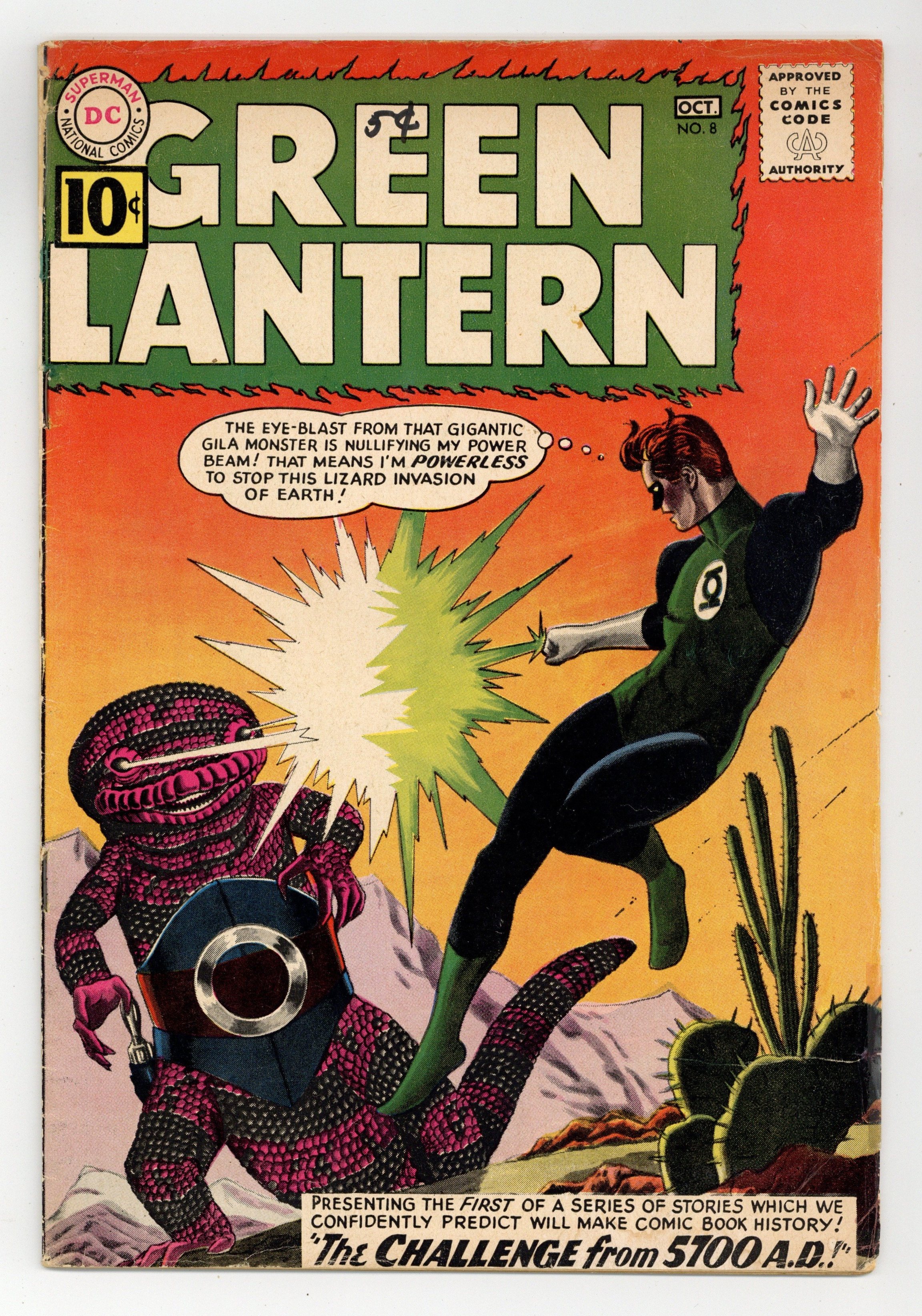 Starts Jan 19 Cover pencils by Gil Kane, inks by Jack Adler. The Challenge From 5700 A.D.!, script by John Broome, pencils by Gil Kane, inks by Joe Giella; Zegors, a highly evolved gila monster form, have the earth under attack in 5700 AD, and the ruling Solarite council brings Hal Jordan to defeat them; He does so by destroying their main weapon and is returned to the present, with no knowledge of his adventure. 36 pgs. $0.10. Cover price $0.10.