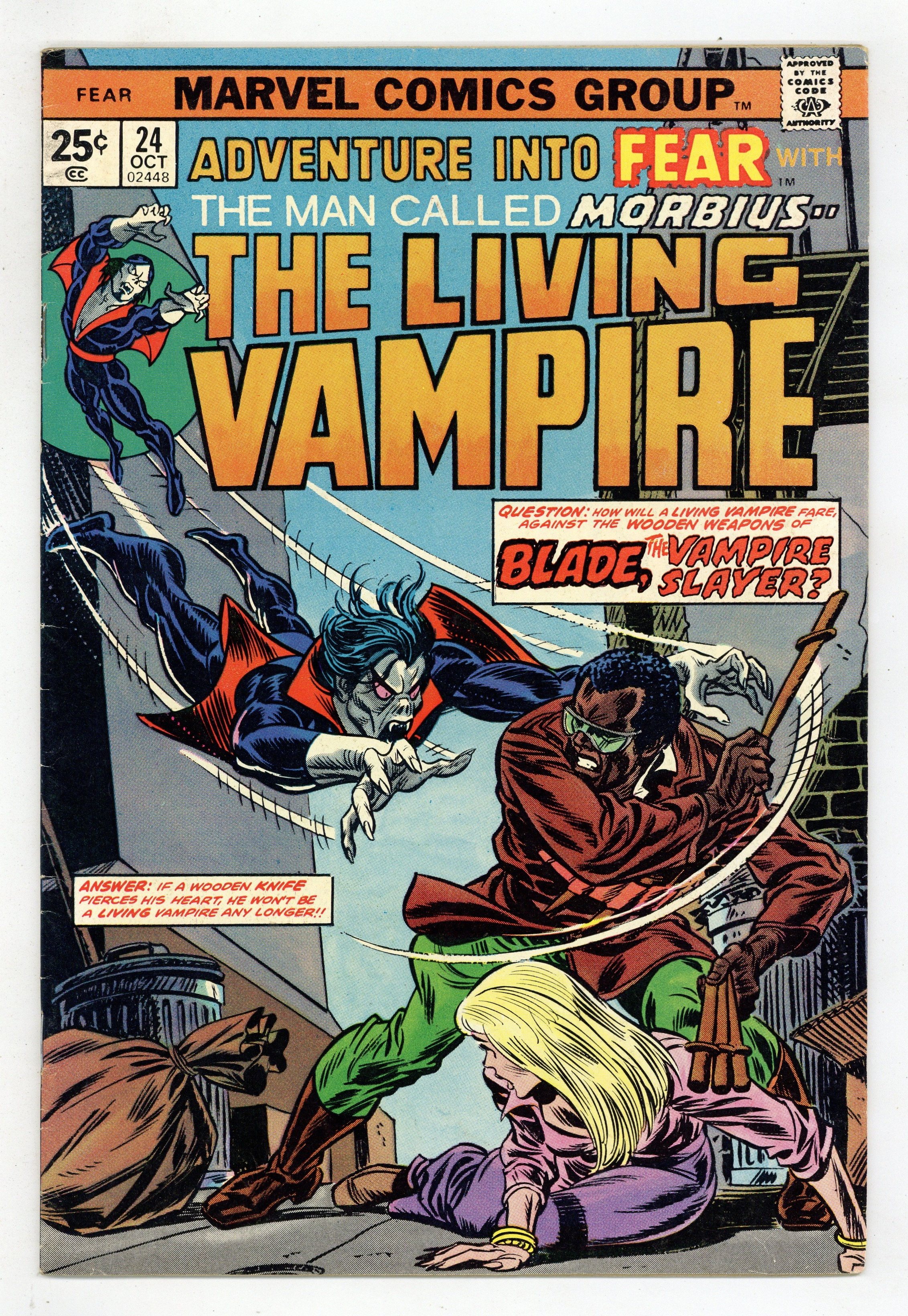 Starts Jan 19 Morbius battles Blade the Vampire Slayer in "Return to Terror!" Script by Steve Gerber, pencils by Craig Russell, inks by Jack Abel. The letters page contains Marvel Value Stamp series A # 38 (Red Sonja by Barry Windsor-Smith). Reprint back-up story: "The Two-Faced Man" with art by Joe Maneely (from World of Suspense 1). Gil Kane cover pencils (John Romita Sr. inks?). Cover price $0.25.