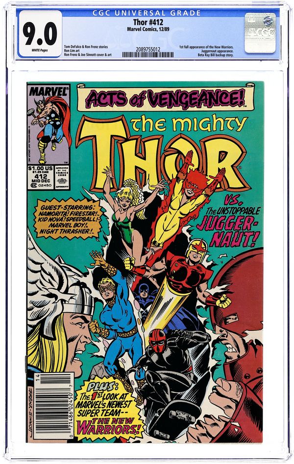 Starts Feb 9 Newsstand Edition. Cover pencils by Ron Frenz, inks by Joe Sinnott. Acts of Vengeance crossover. First full appearance of the New Warriors in "Introducing the New Warriors," script by Ron Frenz (Co-plot) and Tom DeFalco, pencils by Ron Frenz (layouts), inks by Joe Sinnott (finished art); With Thor down for the count, the New Warriors arrive and battle the Juggernaut; Thor recovers his strength and joins the fray as he and the kids are finally able to banish Juggy to another dimension. Beta Ray Bill back-up, "Freedom Is Only A Choice Away," script by Tom DeFalco, pencils by Ron Lim, inks by Mike DeCarlo; Bill has been trapped and is being used to help power a spaceship that feeds off of psychic energy; When the people of his race are threatened, however, he breaks free and faces Captain Orack. 36 pgs., full color. $1.00. Cover price $1.00.