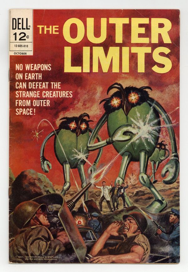 Starts Jan 26 Painted cover by Vic Prezio. Stories by Paul S. Newman. Art by Jack Sparling. Cover number is 12-605-810. Battleground of Monsters. Like the Twilight Zone, but more science fiction than fantasy, The Outer Limits chilled 1950s TV audiences with tales of what-if featuring twist endings. A century's worth of missing-persons reports are explained when aliens arrive on Earth to suggest a sort of cosmic prisoner exchange. But although the first aliens are benevolent, the ones that come after them... are not. 32 pages, Full Color. Cover price $0.12.