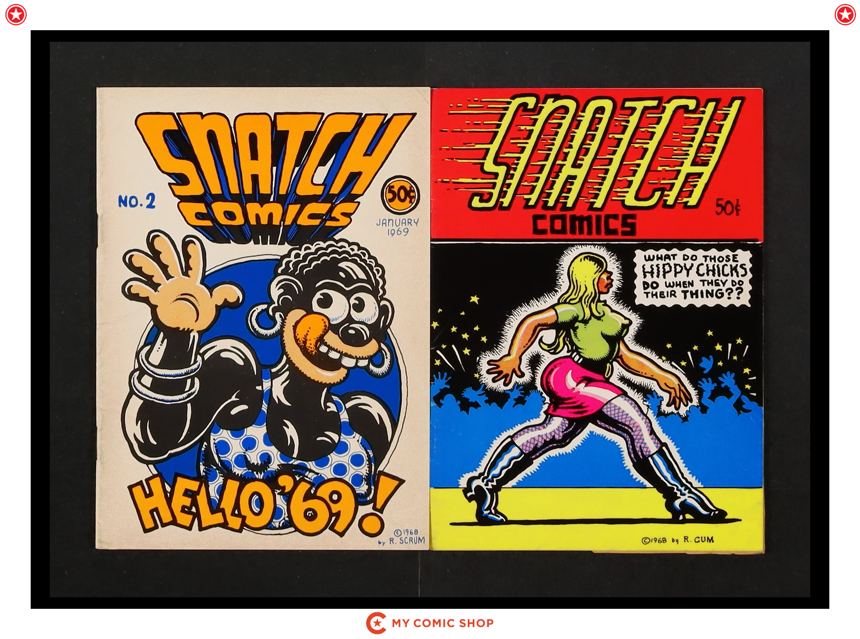 Issues #1 4th printing, and #2 3rd printing of Snatch Comics (1968 Apex/Print Mint). Most will grade in the VG to FN range.